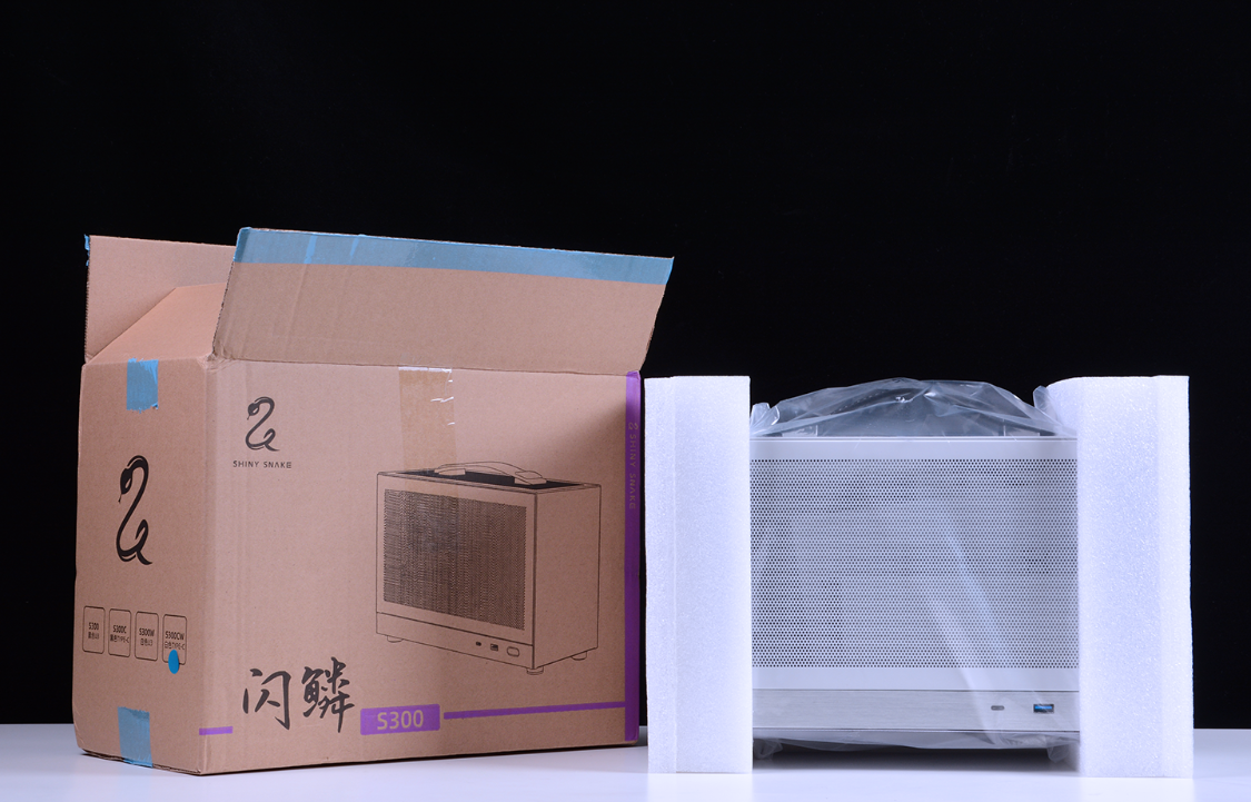 綜合顏值、體積、便攜性、價格等條件後,選定的機箱爲閃鱗S300便攜式ITX手提機箱。簡單的牛皮紙加簡潔的設計風格外包裝,箱內兩塊泡棉爲機箱承擔了所有(將機箱護得牢牢的);