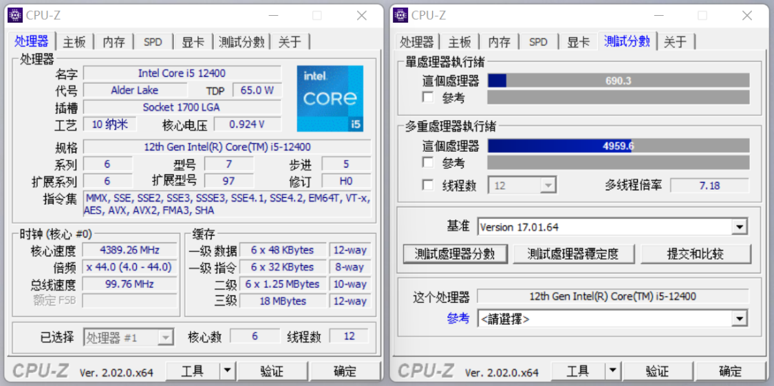 CPU-Z測試,CPU單核得分690.3分,多核得分4959.6分