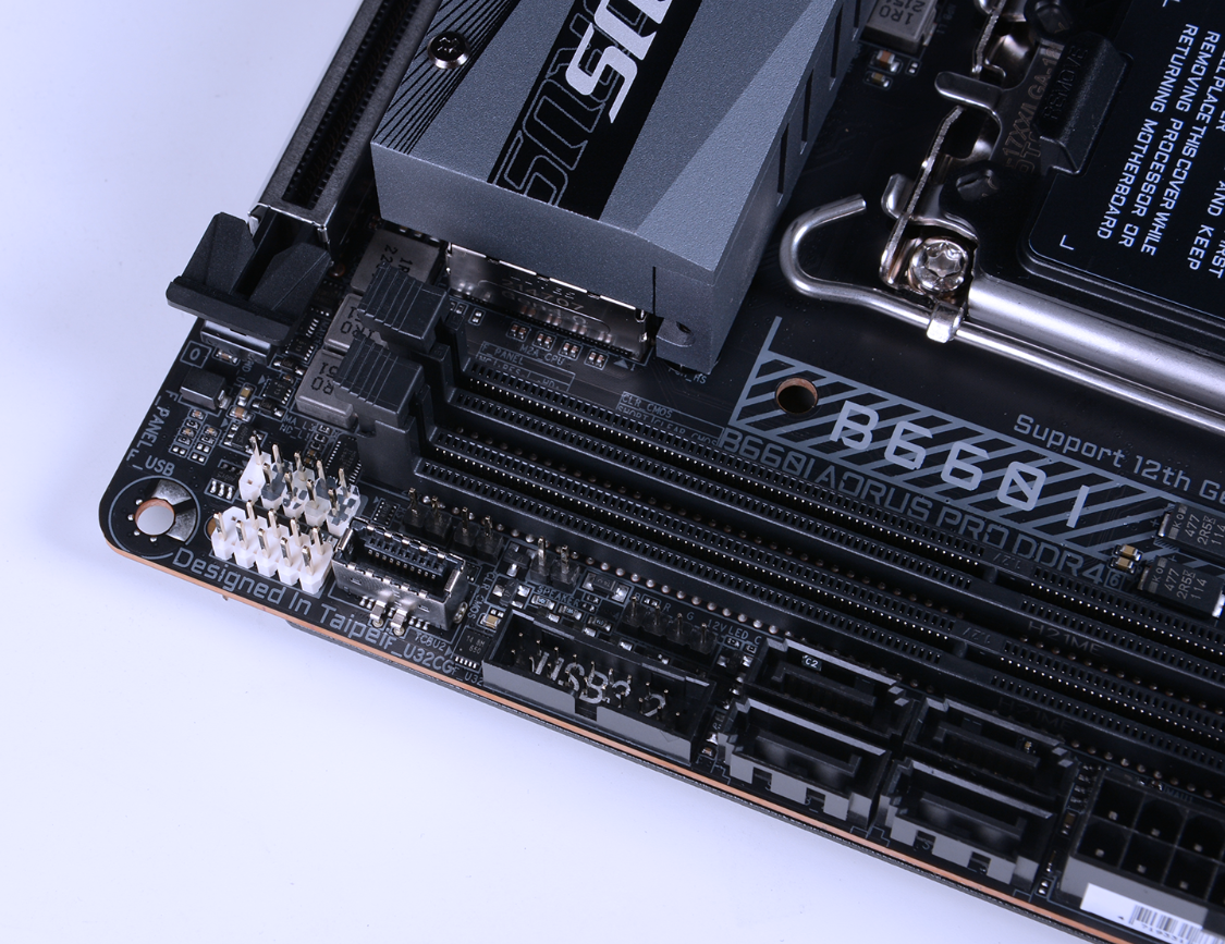 主板搭載一個PCI-E 4.0 x4 高速M.2插槽,採用堆疊式的散熱模塊,保證散熱效能的同時,也讓主板表面結構更加和諧;此外,主板還配備的4個SATA3.0拓展存儲接口;