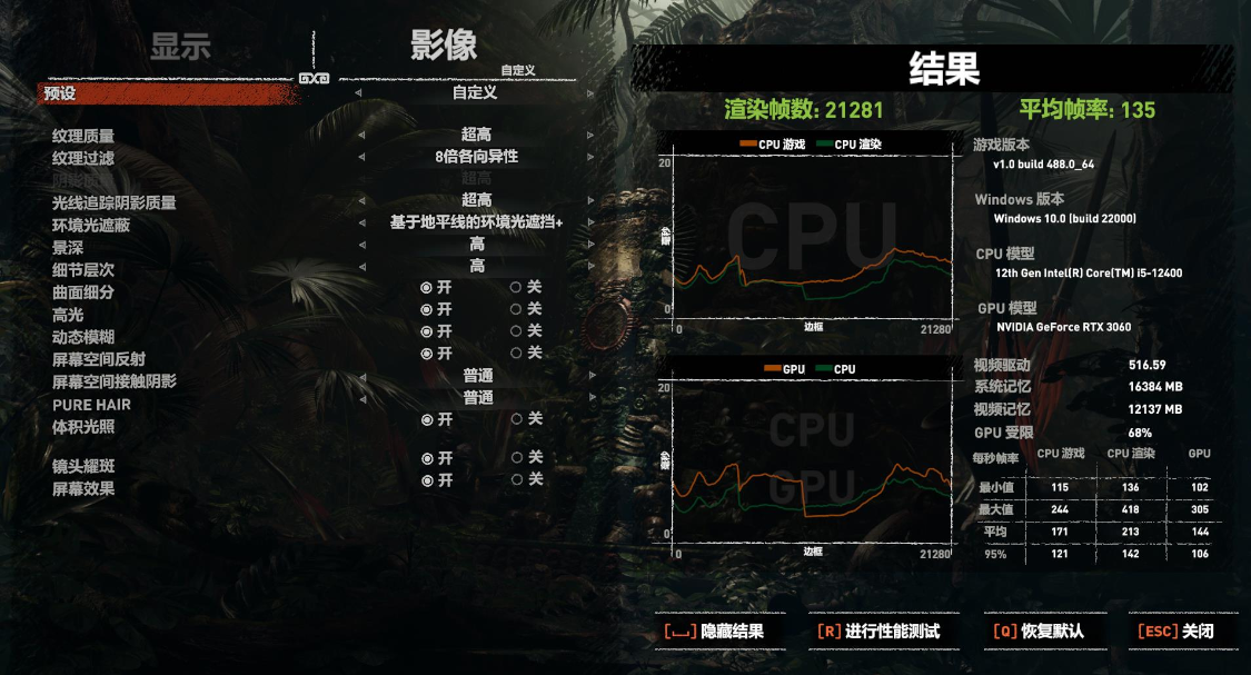 《古墓麗影·暗影》遊戲測試,DLSS拉滿,最高畫質,開啓光追,1080P分辨率的幀率爲135FPS,2K分辨率的幀率爲113FPS;
