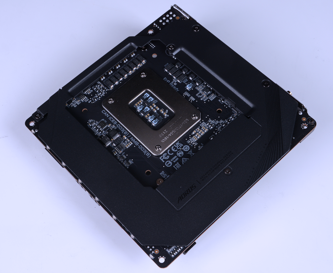 主板背面,配備了一塊高強度的金屬背板(可以對小身材主板進行更充分的保障),絕對是頂級旗艦主板的待遇,也讓主板整體質感與逼格都得到進一步的拔高;