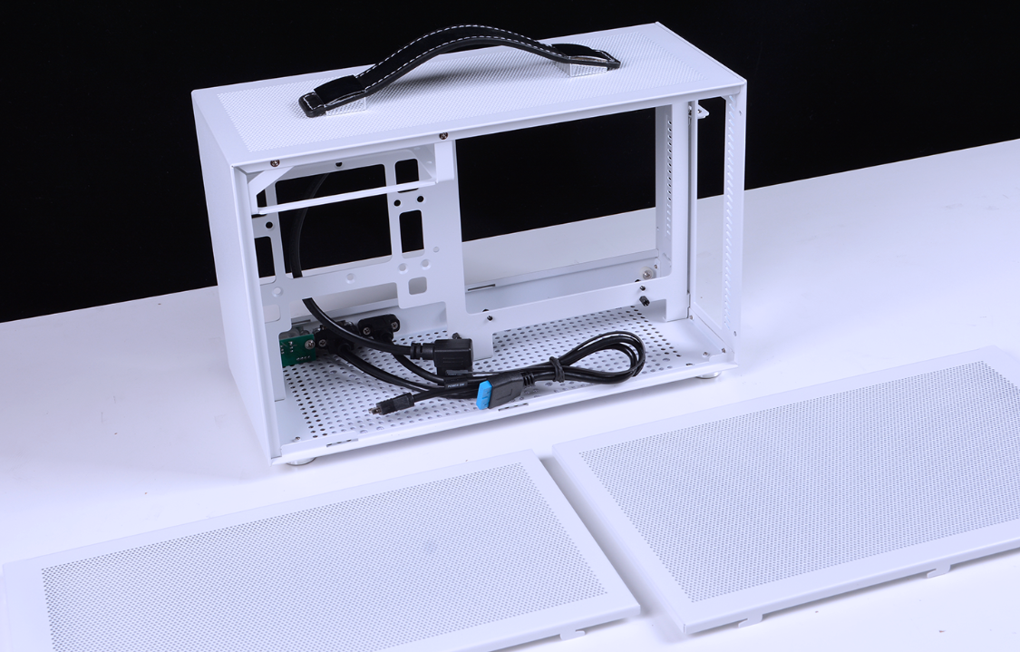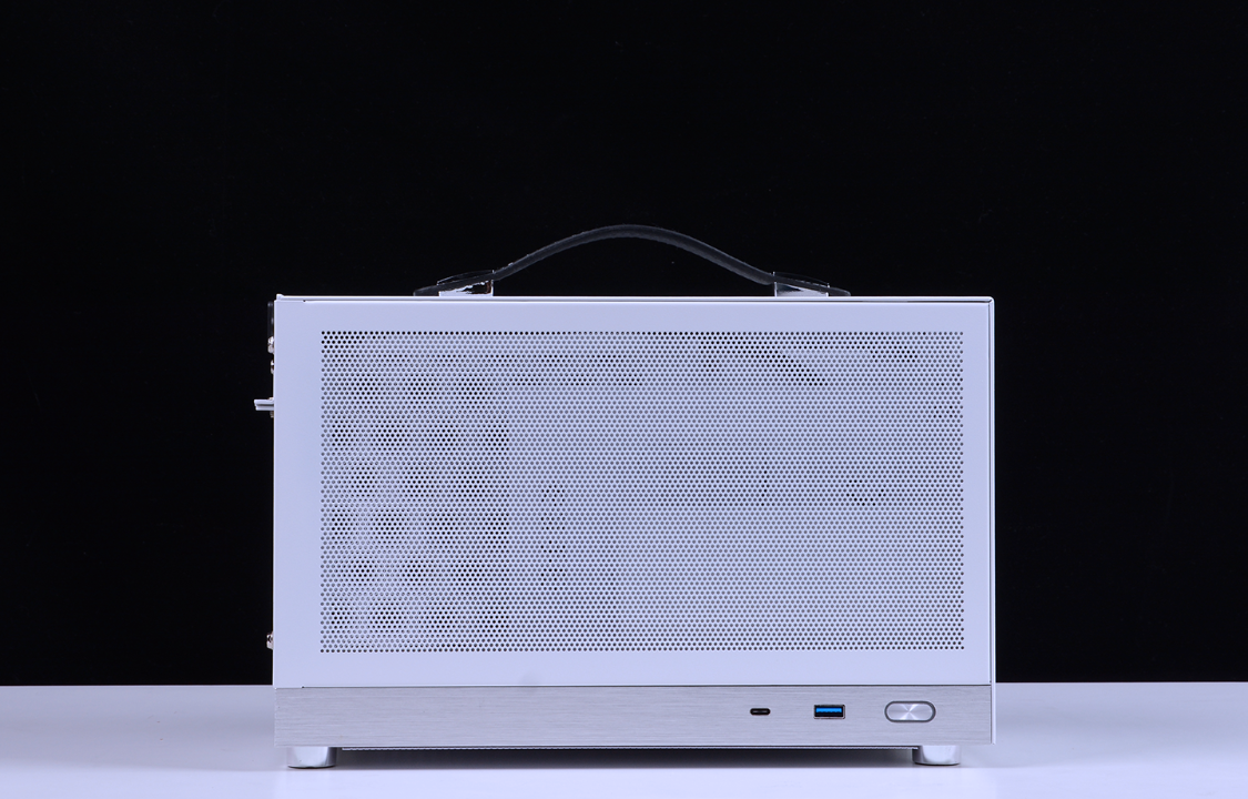機箱側面採用MESH面板,細密的網孔佈局,有助於進出風,也具備不錯的防灰塵的作用。左側板下方有一塊陽極氧化工藝+拉絲工藝處理的鋁材面板,右側是機箱IO面板:開機鍵+ USB3.0 +Type-C接口。另一側,則是整面網孔設計;
