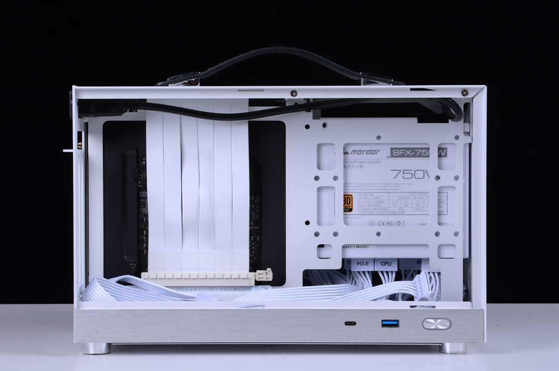 機箱電源安裝在主板平臺一側,需先取下電源支架再進行安裝。今天裝機選擇的是Almordor 750W全模組 SFX電源,Almordor(神鵰十三道),土味兒十足的國產品牌,之前有用過他們家黑色的SFX電源,這次給媳婦兒直接整個白的。