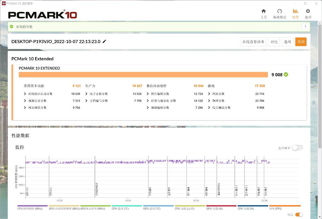 在PC Mark Extended的整機測試中,整機得分9008分,常用基本功能得分9121分,生產力得分10267分,數位內容創作得分10946分,遊戲性能測試得分17358分。