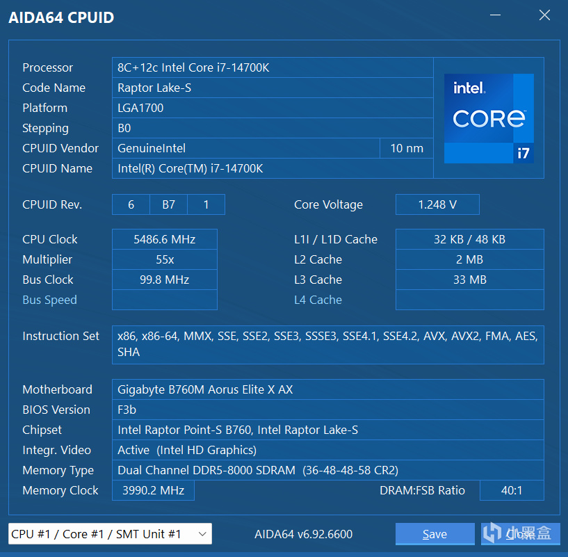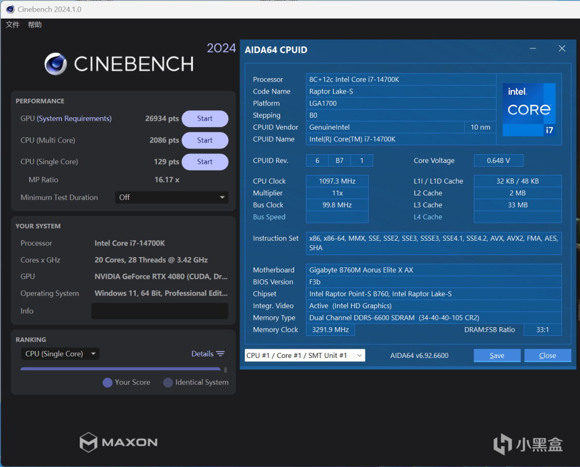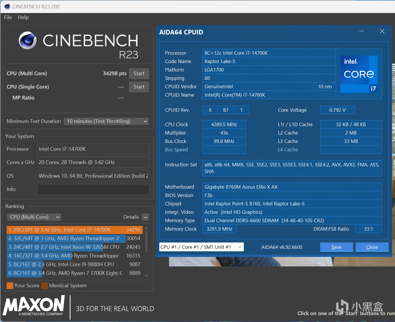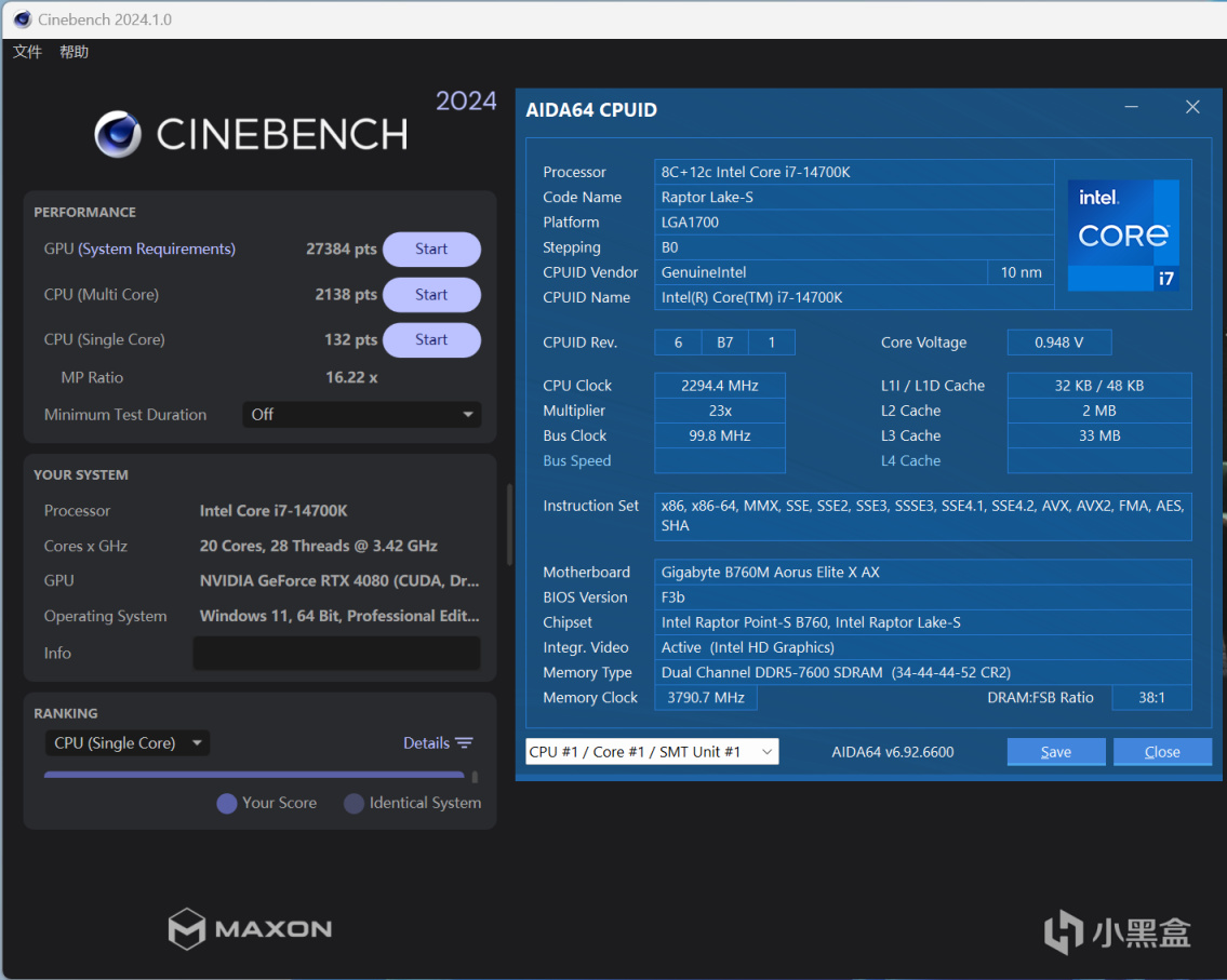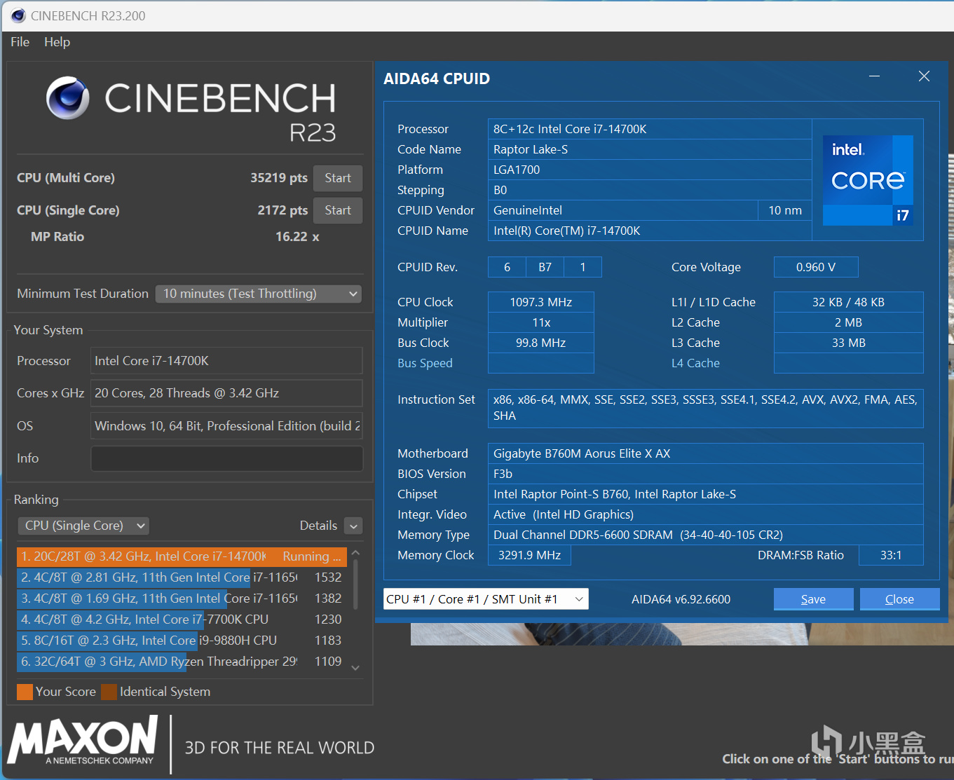 當然,降壓後除了烤機溫度以外,也應該關注跑分,畢竟過度降壓會嚴重影響性能的。上述-0.15V降壓後,14700K十分鐘循環多核跑分提升至35219 pts,此時的狀態已經和Z790沒有任何區別了,單核分數則是2172 pts,降壓與否都不影響。