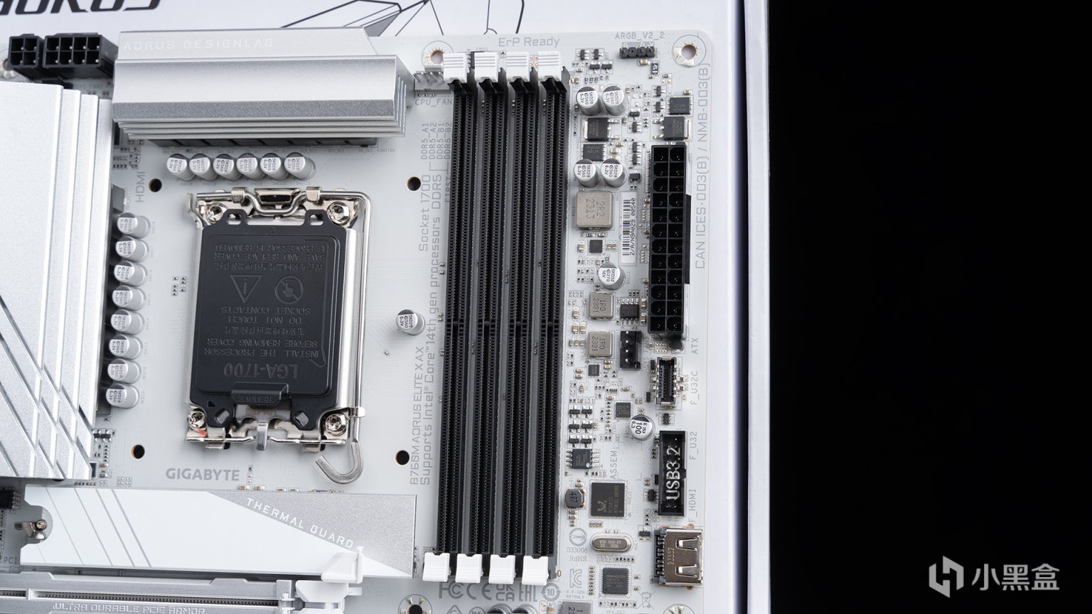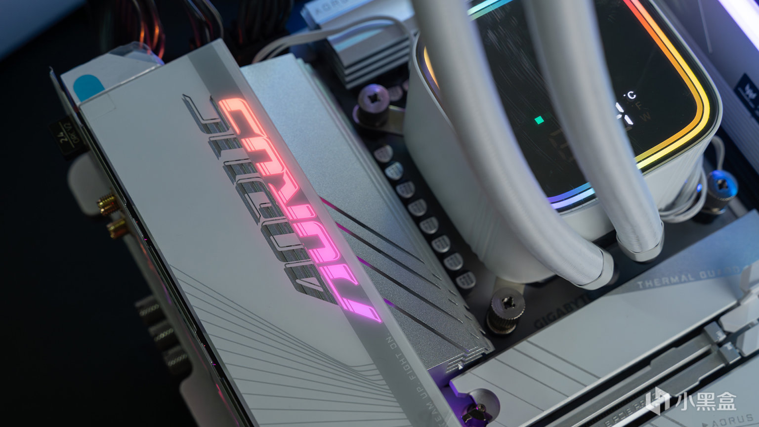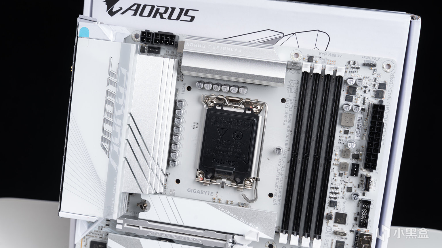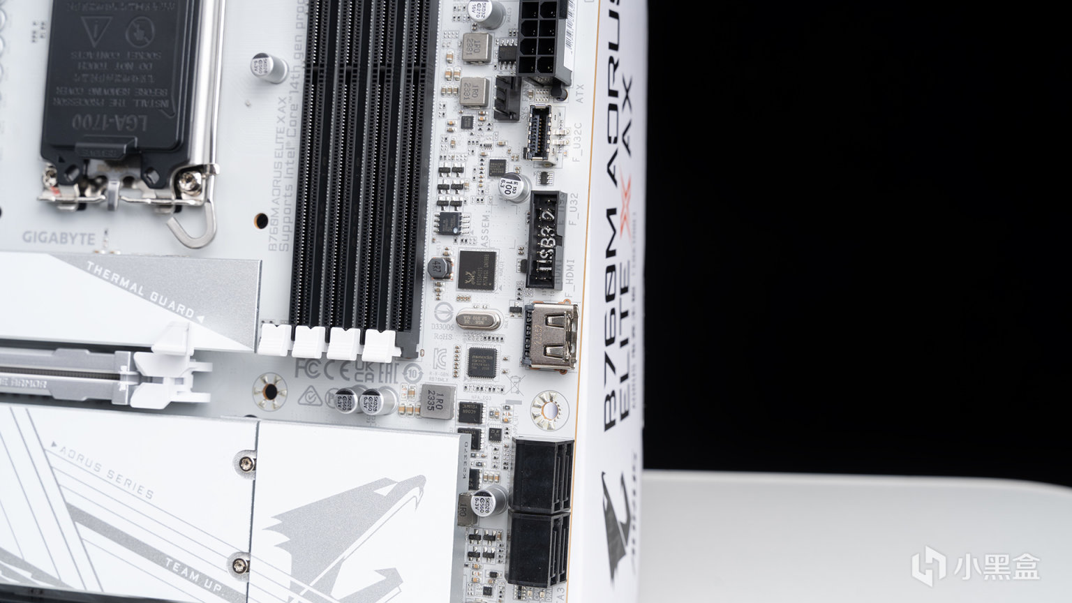 首先能看到主板供電採用14+1+1相,其中14相服務於CPU VCore部分,並採用60A Dr.Mos,用料延續了B760M電競雕的優良傳統,這種規模帶i9級別處理器都不成問題。它覆蓋了散熱面積巨大的裝甲,在I/O裝甲處還能看到碩大AORUS LOGO,支持ARGB燈效。