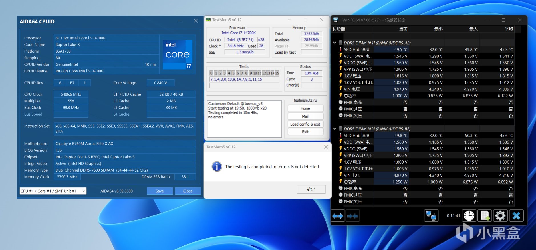 內存超頻上限是由CPU、內存和主板三者決定的,手上這顆14700K屬於大衆體質,也就是剛好合格的水平,在B760M冰雕X上能超頻至DDR5-7600C34並優化大部分小參,VDDQ CPU和VDD2 CPU則是1.40V和1.41V,VDD內存和VDDQ電壓統一爲1.55V