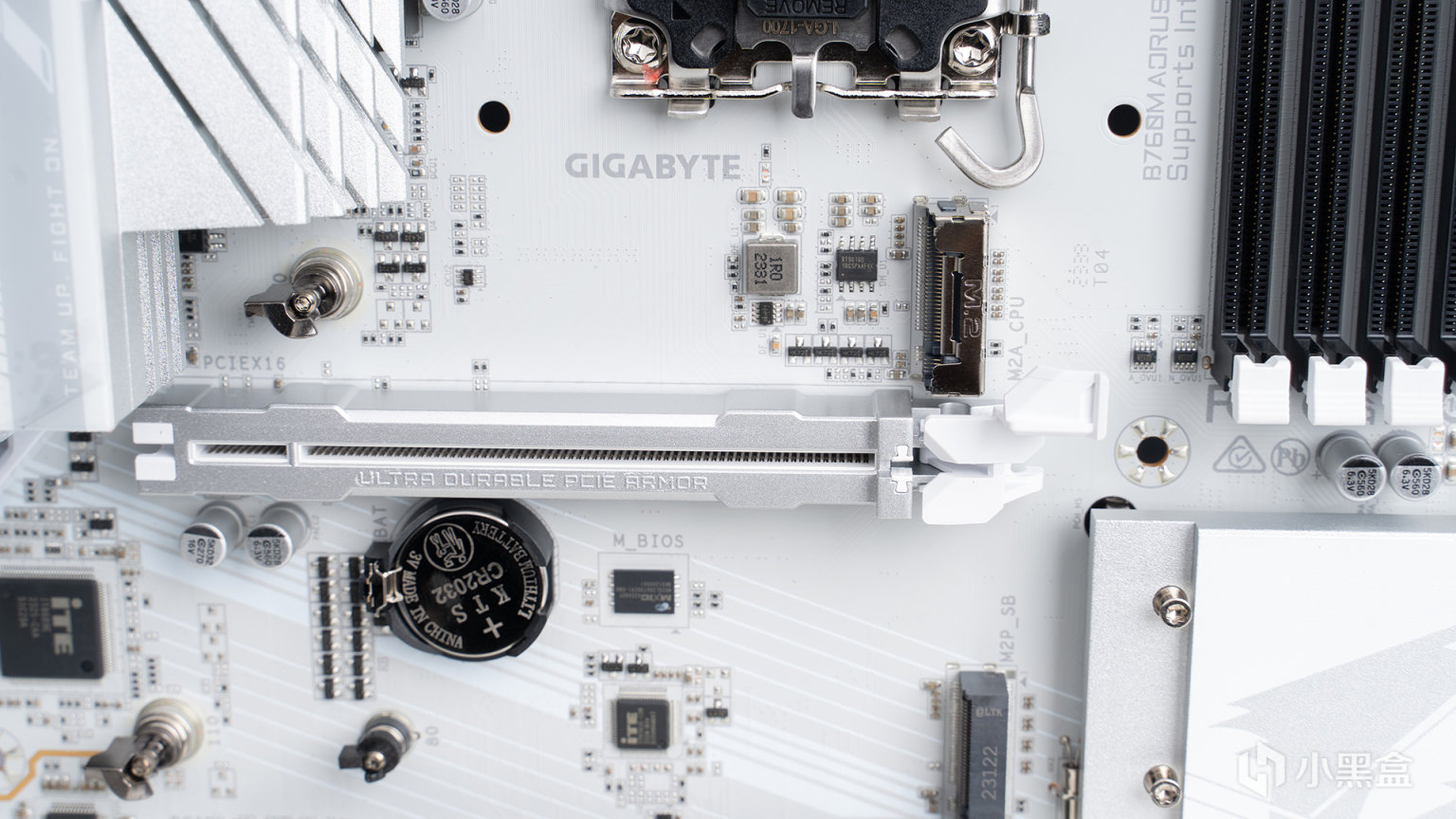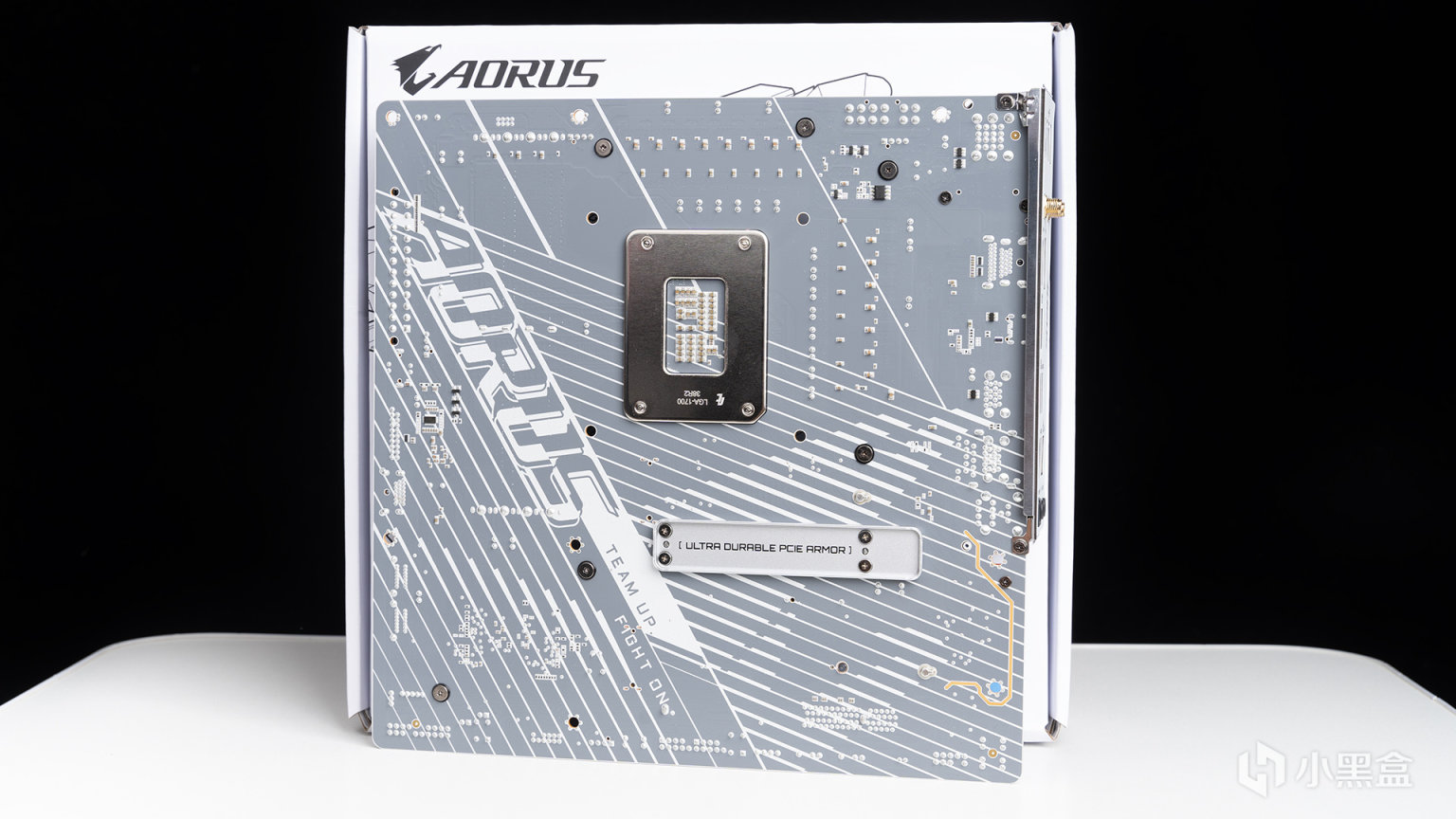 翻過來主板背面,能看到對應顯卡插槽處有一體式的背板加強設計,官方宣傳可提高10倍承載能力,這種看着就特別堅固的賣點,在其他千元級主板甚至兩千級都是很少見,只能說技嘉這波操作滿分。