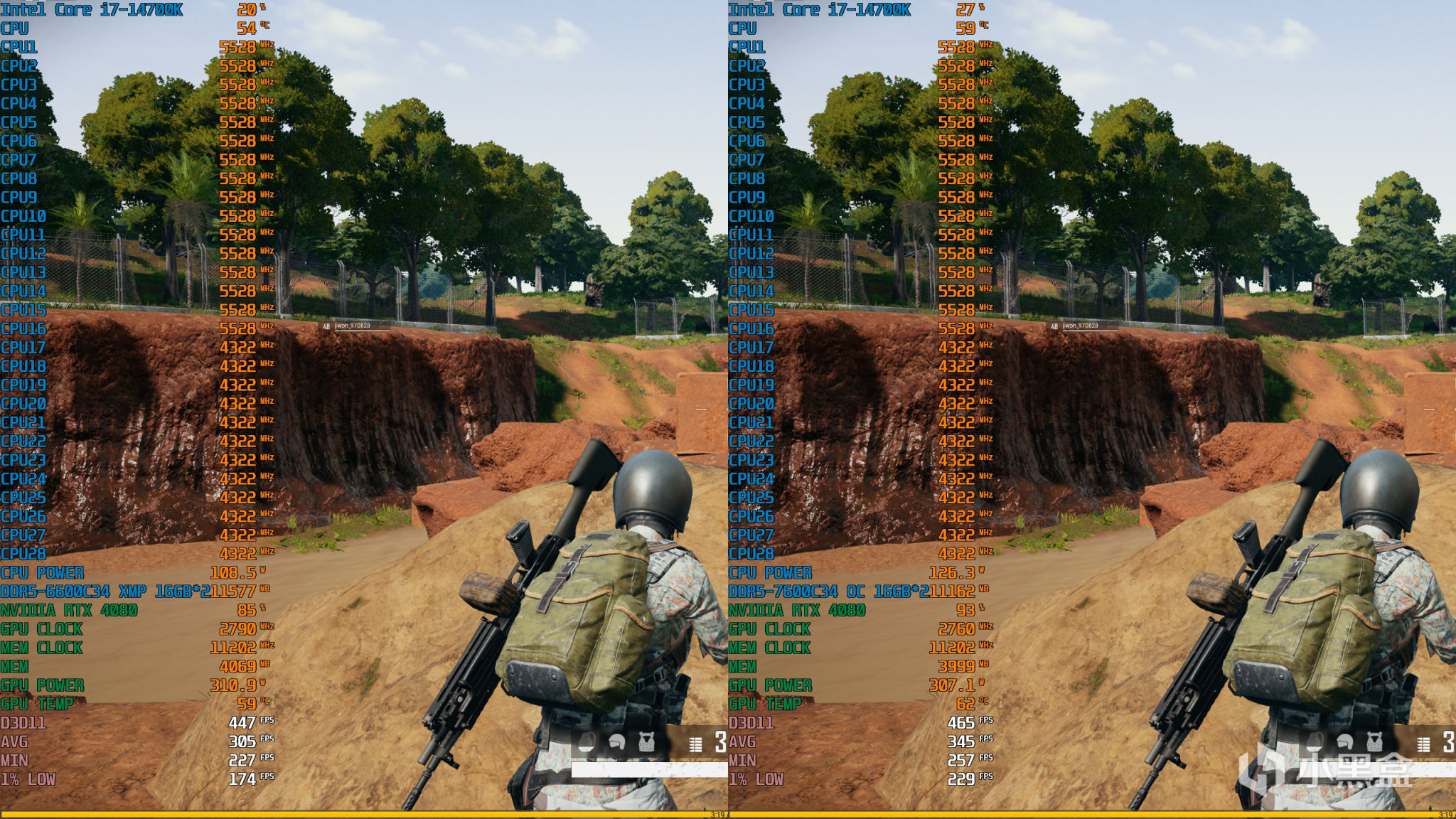 最後是《絕地求生》遊戲測試,即便是在2K分辨率+120%渲染+三超高畫質情況下,手動超頻相比XMP配置依然可以獲得13%左右幅度的提升(平均幀和1%LOW幀),如果你是重度喫雞玩家,那必須得手動超一超,遊戲的流暢度明顯絲滑不少的,即便不懂超頻D5黑科技開一開也是方便的。
