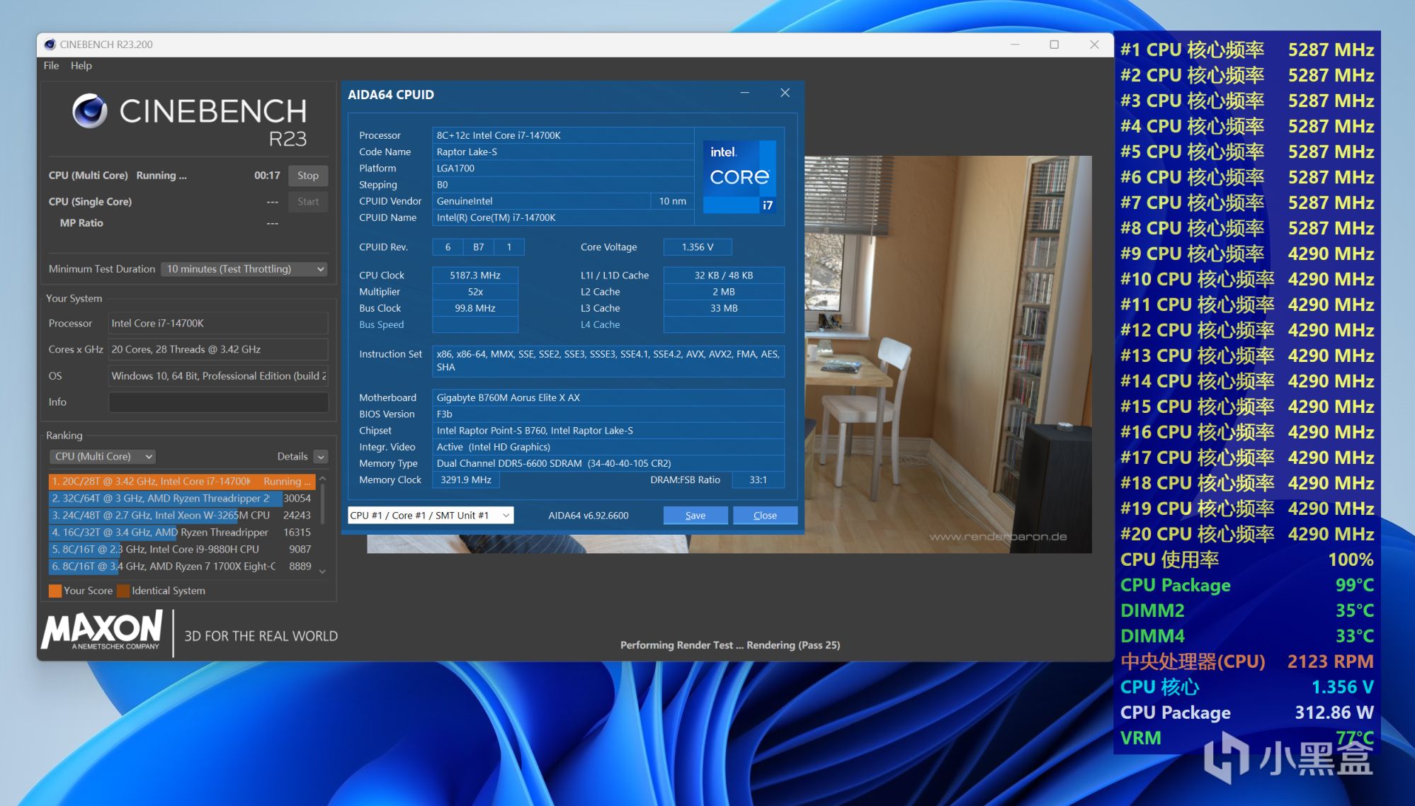 默認XMP配置不降壓,在運行CINEBENCH R23十分鐘循環項目時,主板分配的CPU核心電壓高達1.35V,這對於14700K來說毫無疑問是個非常恐怖的電壓值,CPU Package功耗達到312W,任何一款AIO 360水冷都難以壓制。