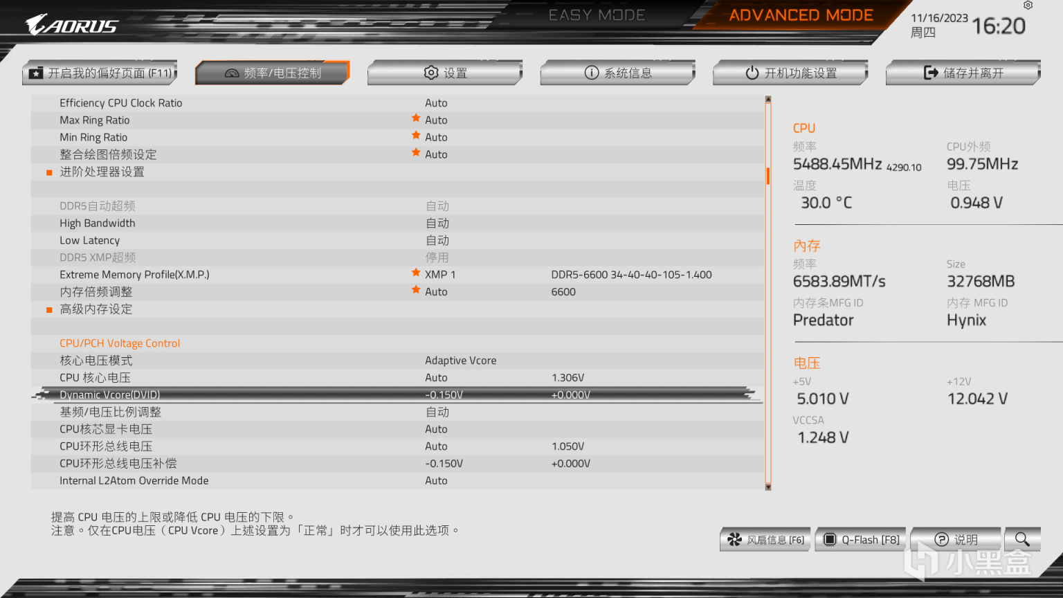 B760M冰雕X最新BIOS版本已經集成104微碼,可以通過降壓的方式一定程度上繞開B760芯片組的CEP限制,具體操作起來也簡單,在BIOS頻率/電壓控制分頁中,選擇MCU模式切換104微碼,選擇Adaptive Vcore模式,在Dynamic Vcore選項中填入負值(CPU環形電壓選項可同步),手上這顆14700K一次到位就能做到-0.15V大幅降壓操作,非常給力。