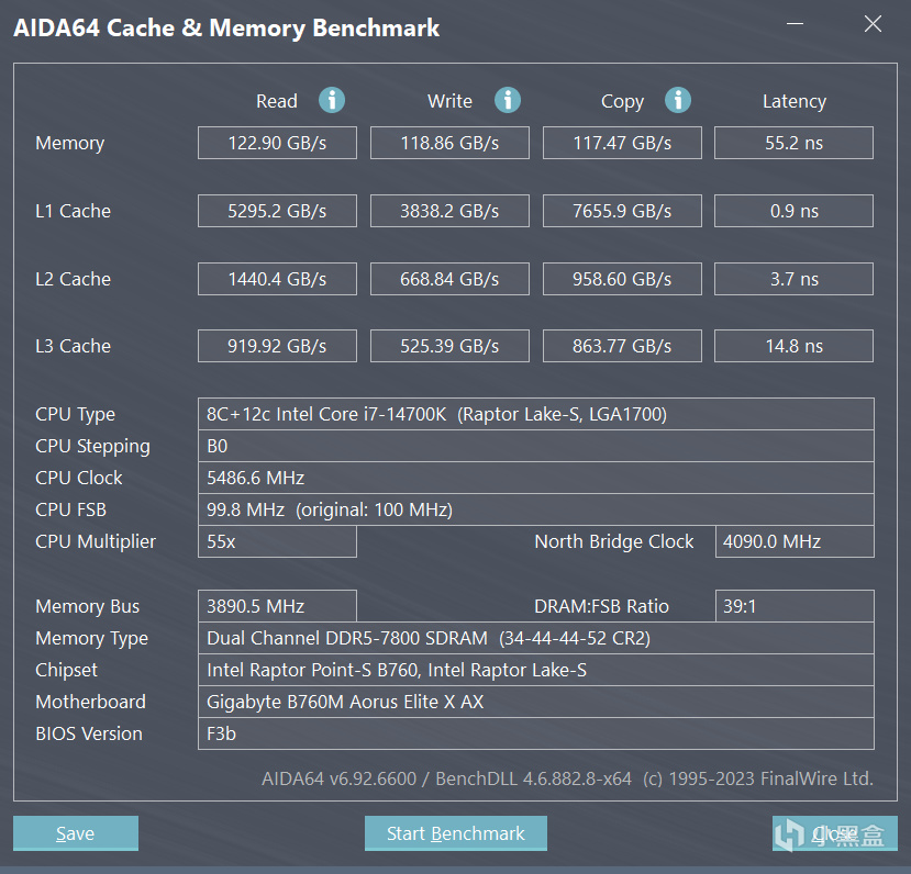OC配置Vesta II RGB DDR5 7800C34-44-44-52,AIDA64內存和緩存測試