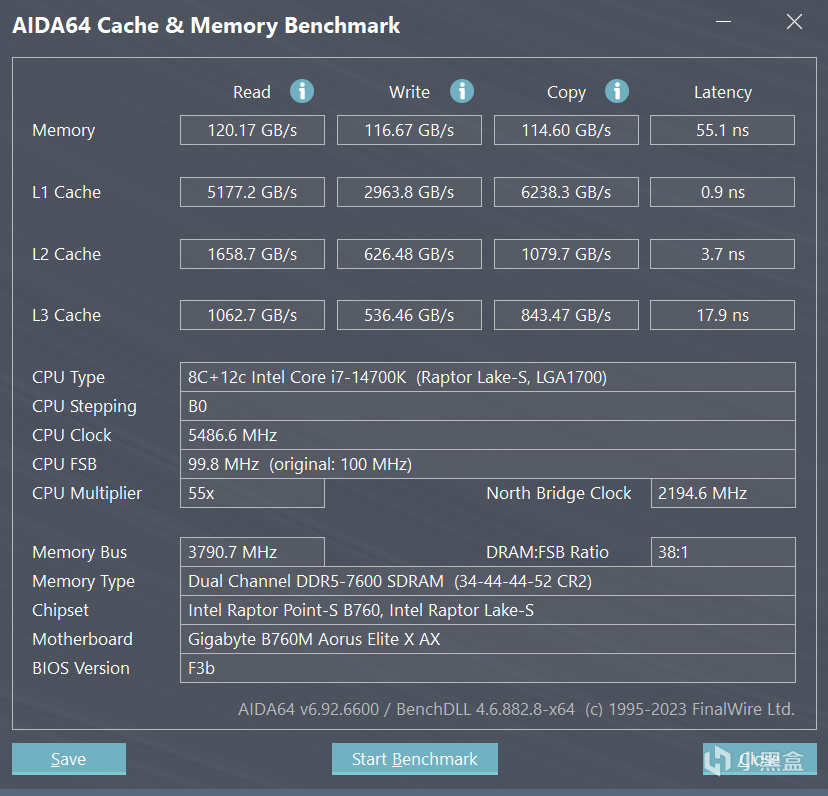 OC配置Vesta II RGB DDR5 7600C34-44-44-52,AIDA64內存和緩存測試