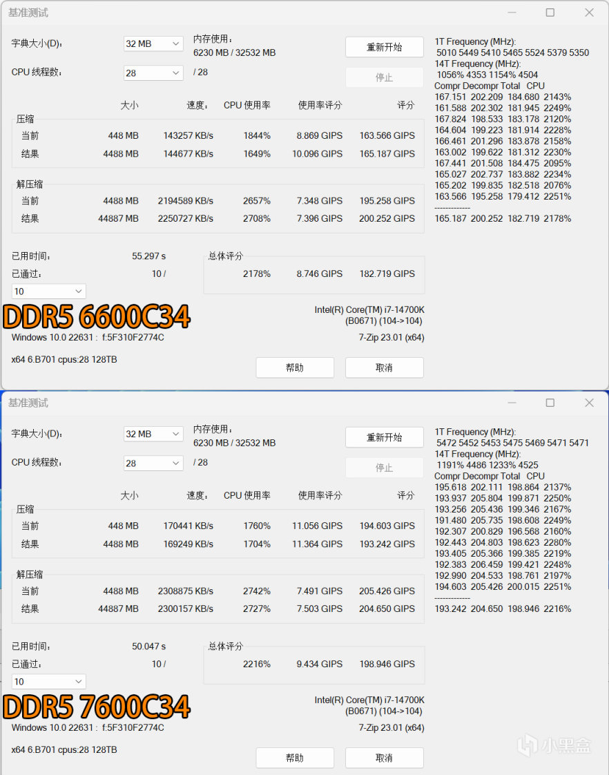7-ZIP基準測試也是一個比較喫內存性能的項目,手動超頻的主要在於壓縮方面,提升幅度達到了17%之多,體現在實際應用當中這是一個客觀的效率提升,解壓縮則主要依賴於CPU多線程性能,提升並不是特別大。