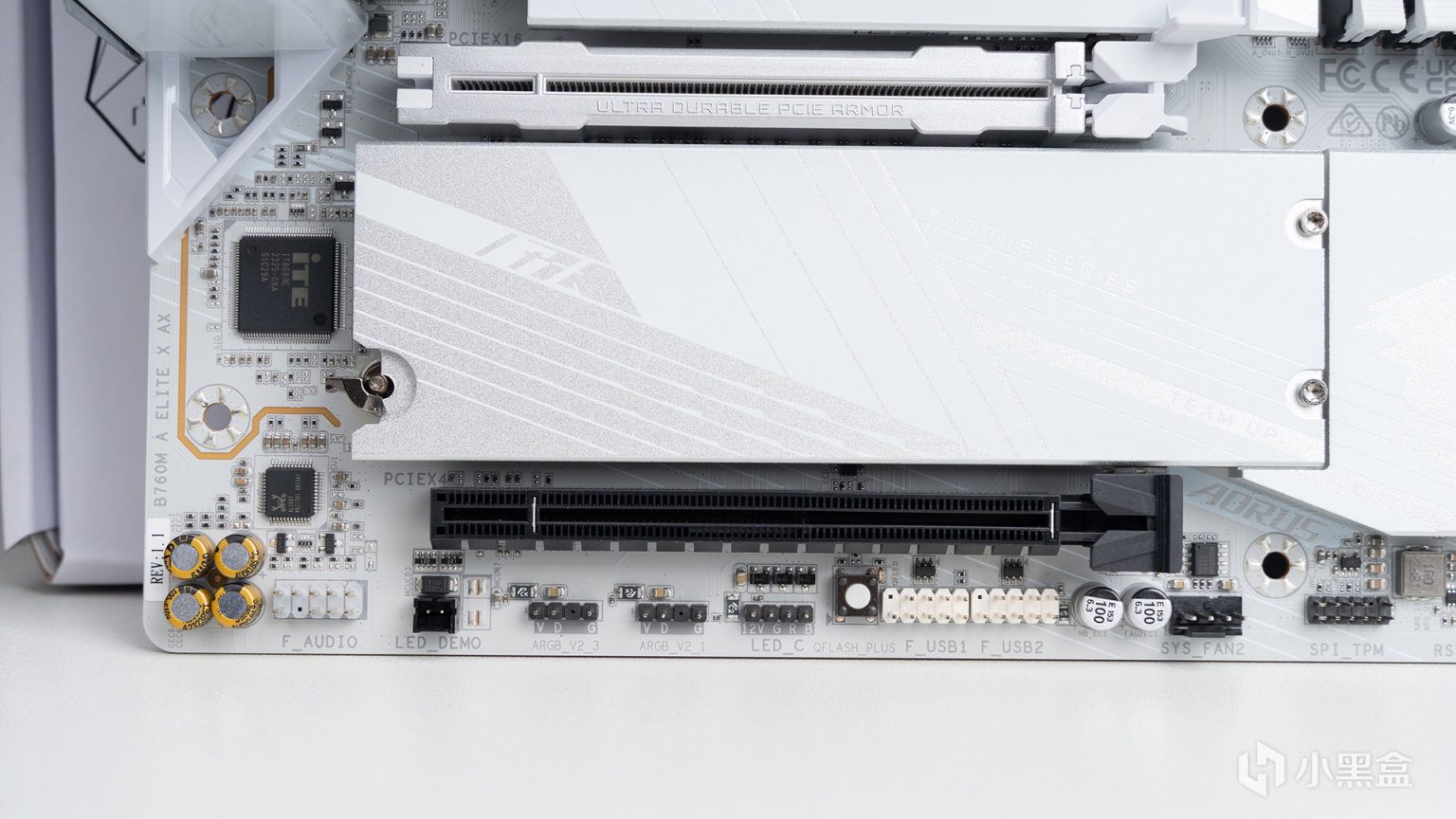 擴展槽和M.2存儲方面,B760M冰雕X擁有兩根全長的PCI-C X16插槽,第一根支持到PCIe 5.0以及X16速率,而第二根則是PCIe 4.0X4速率。M.2插槽擁有兩組,均支持PCIe 4.0X4,覆蓋有專屬的M.2散熱裝甲,並且採用快易拆結構,這種結構是金屬打造的,並且存在於裝甲上,這也就意味着從拆卸裝甲到安裝M.2 SSD,全程都是免工具。