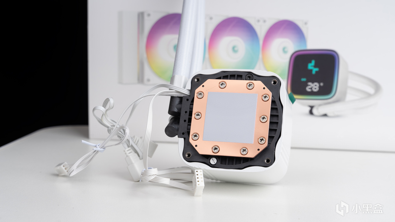 水冷採用大尺寸紫銅底座,能夠更好貼合CPU,出廠狀態下已經預塗好硅脂,簡化了裝機流程。