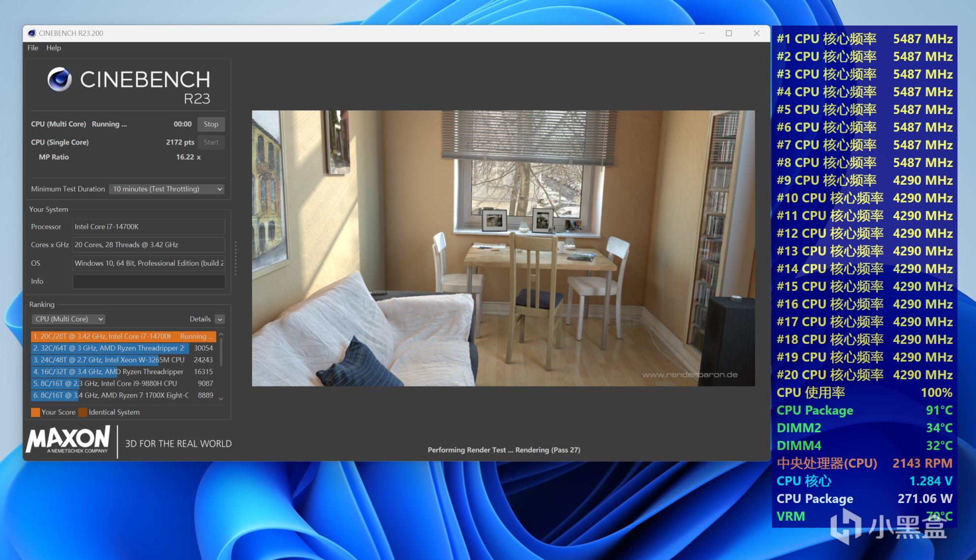 進行-0.15V降壓後,14700K烤機時CPU電壓降至1.28V,CPU Package功耗降到了270W,這種功耗依然對CPU散熱器有着嚴峻的考驗,搭載的冰堡壘360青春版數顯也很給力,十分鐘把CPU Package溫度壓制在91℃(室溫18℃左右),主板VRM溫度從降至70℃,14700K恢復P核5.5GHz+E核4.3GHz滿血狀態。