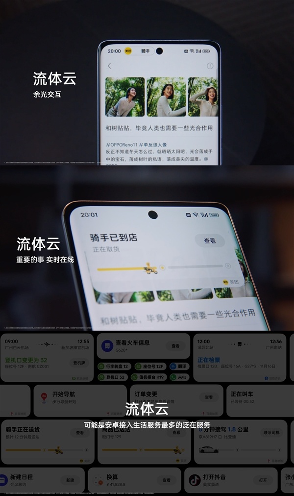 具体而言,ColorOS 14新增流体云,能随时根据服务状态与内容,以气泡、胶囊、面板三种形态,有主次、有节奏地进行实时提醒,让用户无需切换应用就能一眼获知重要信息。