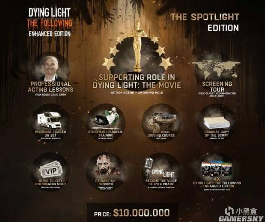 售价:1000万美金,折合人民币7000万!没错,荣登史上最贵游戏典藏版的就是《消逝的光芒:强化版》的另一个极为疯狂的终极典藏版——「聚光灯版」。 而这个版本的诞生其实与《消逝的光芒》电影版计画有着非常密切的关系,因为只要是购买这个「聚光灯版」的玩家,就能够在这部《消逝的光芒》电影版演出有台词有动作戏的重要配角,为了让每位购买这版本的玩家都能有最棒的演出,这版本还附赠了专业的演员训练课程、专属的片场休息拖车,以及跑酷训练课程、前往拍摄地点的指定来回机票等,喔,对了……还有游戏本体四套。