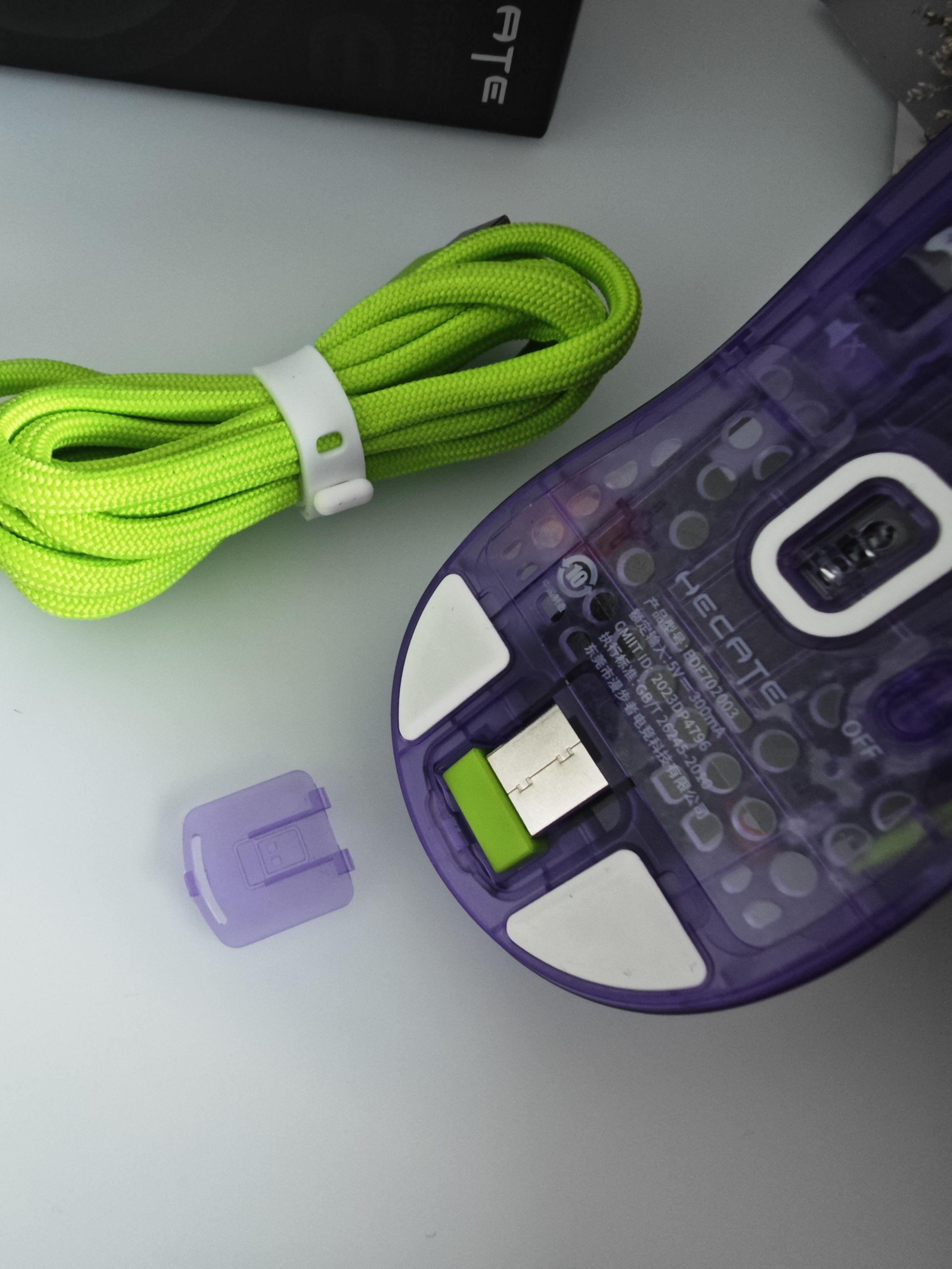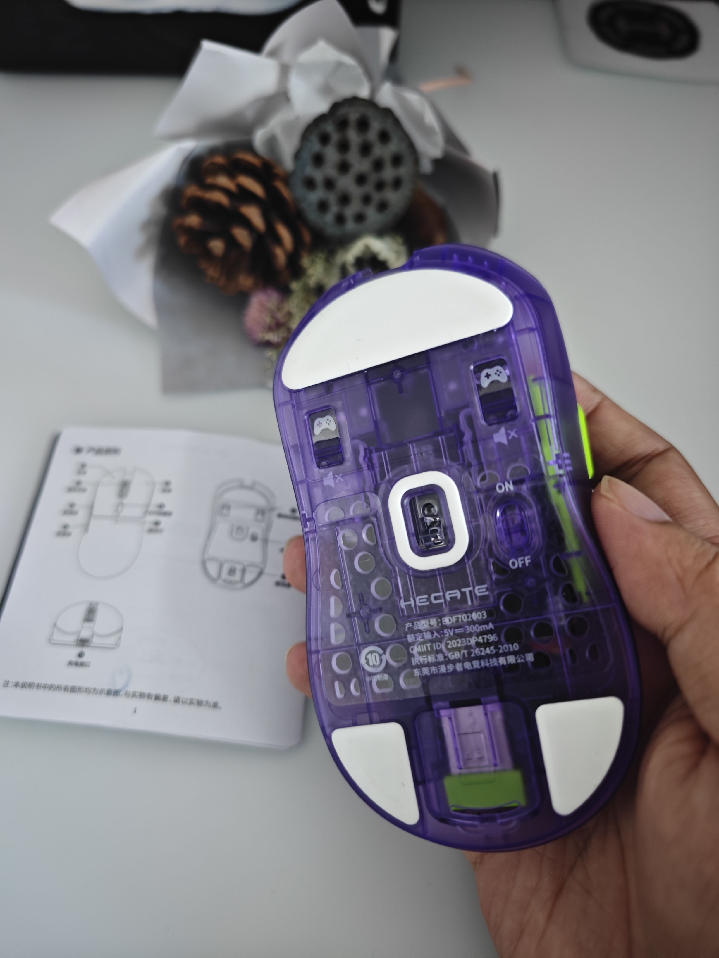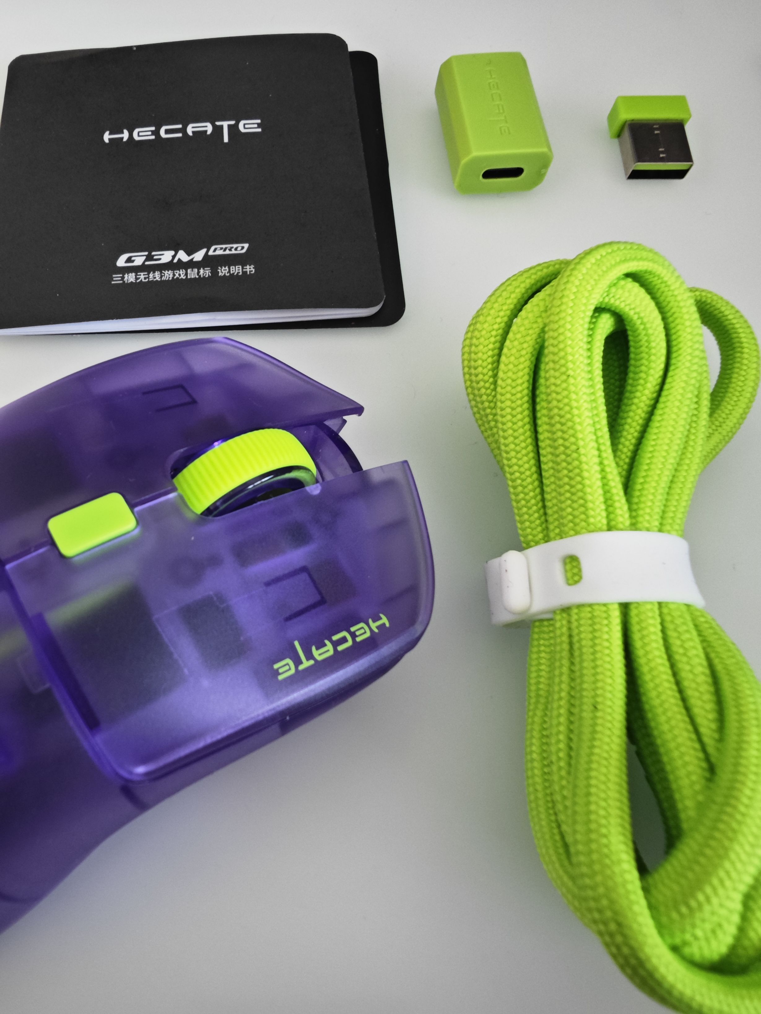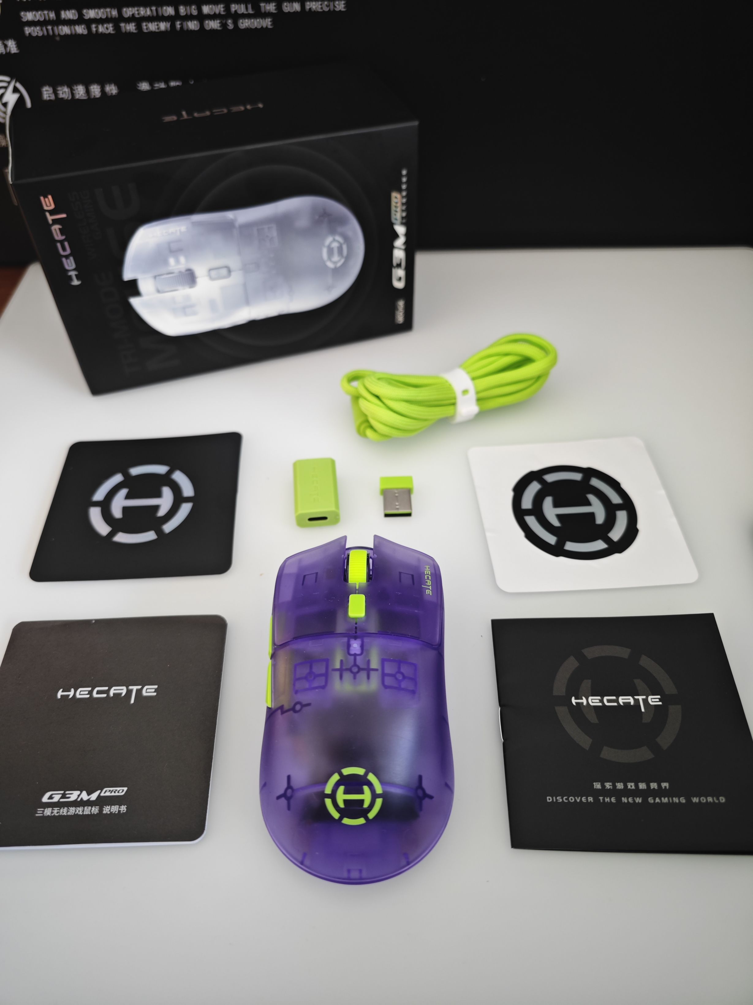 G3MPro靈能版包含白色,青色,紫色三個款式。小航母測評是紫色款,紫色底配上綠色按鍵,有一種EVA初號機的感覺。鼠標使用了類狗屁王的模具,看上去很圓潤。118.7mm×61mm×38.6mm的尺寸,適合中小手。使用了親膚材質,即使是汗手玩家,也不打滑不打油。66g輕量化設計,握起來非常輕巧。適合抓握,指握。