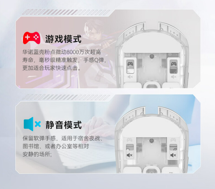 G3MPro靈能版這種雙微動設計,其實最適合學生黨。因爲有不少大學生,在宿舍用電腦打遊戲需要遊戲機械微動。同時又會把電腦帶去課堂,圖書館,實驗室等。這時候就有了鼠標的靜音需求,而且週末晚上在宿舍夜戰排位,用靜音微動也能減少宿舍矛盾。
