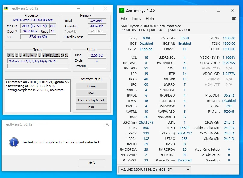 傳承自前代CJR的優秀性能,這套內存可以輕而易舉地達到3800Mhz的最高同步頻率。稍微增加至1.45V電壓,便能做到CL18-21-19的時序,tRFC則控制在500T上下。縱覽16Gbit的大容量顆粒,這樣的成績已屬同級翹楚。