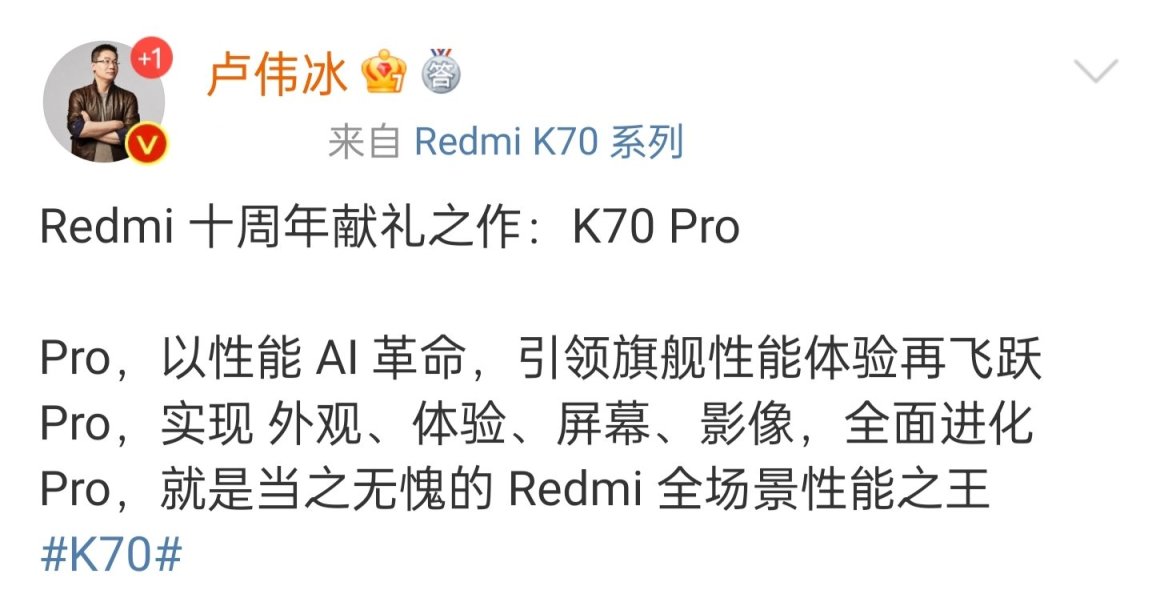 自從盧總宣佈小米 Redmi 十週年暨 K70 系列手機新品發佈會即將於 11 月 29 日舉行,全新 Redmi K70 系列手機將正式發佈。盧總現在幾乎每天都發幾帖爲Redmi K70 系列預熱,根據盧總的預熱可以得出部分關於Redmi K70 Pro的信息,以下爲這幾天Redmi K70 Pro的信息彙總: