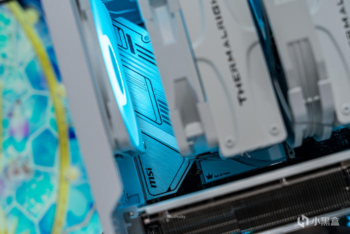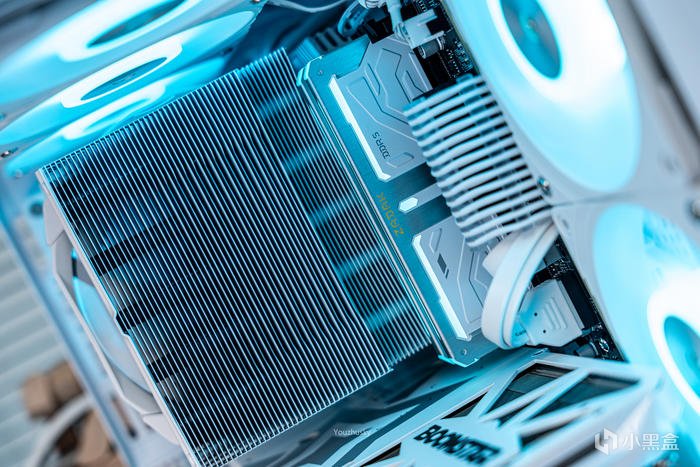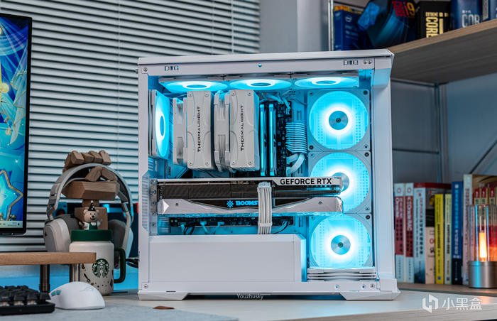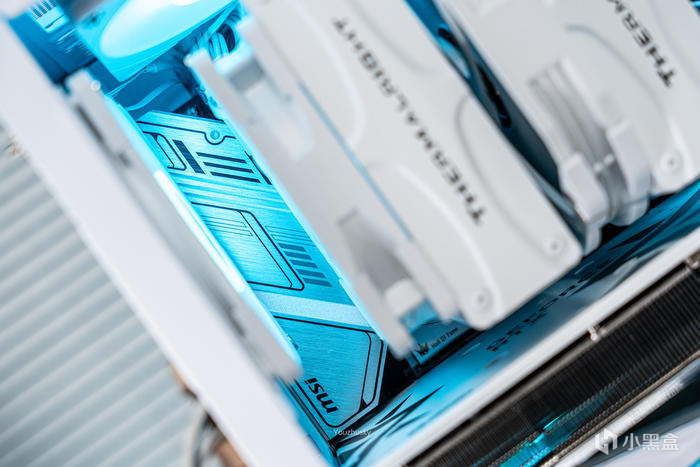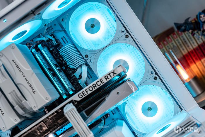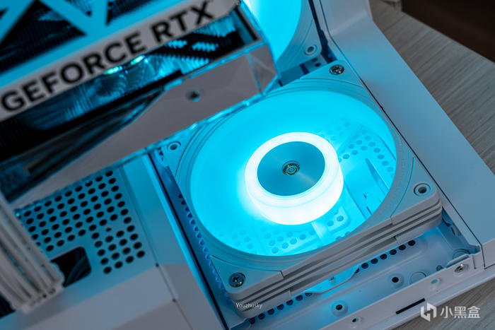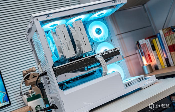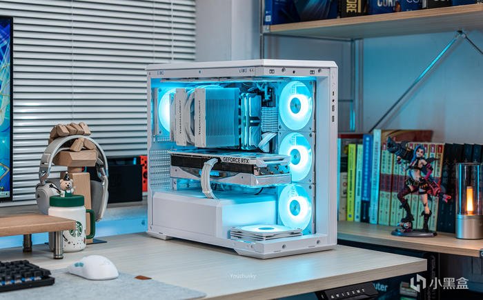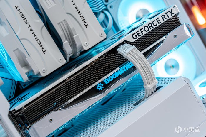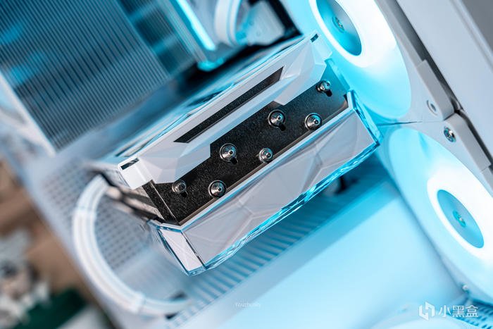 純白主題搭建使用了影馳的GEFORCE RTX 4090 星曜OC,它採用了英偉達 Ada lovelace的核心架構的AD102-300的大核心,採用臺積電TSMC 4N工藝、608 mm核心面積、763 億晶體管數量,具有16384 CUDA處理器和24GB GDDR6X 384bit的21Gbps高速顯存。與此同時,Ada架構還搭載了第四代Tensor Cores 、優化光線追蹤處理的着色器執行重排序(SER)、支持AV1的雙NVIDIA編碼器、優化系統延遲的NVIDIA Reflex技術和更強大的流式多處理器,讓本就強悍的遊戲性能對專業性能也獲得顯著提升。4090星曜OC這次採用的600W散熱級別的星卓III散熱器,採用了全覆蓋均熱板+9根鍍鎳複合熱管的超大規模,以及3個專屬102mm靜霜大風扇,顯卡主板更是配備20+4相全貼片的數字供電設計與600W 12VHPWR接口爲顯卡盡情釋放性能。