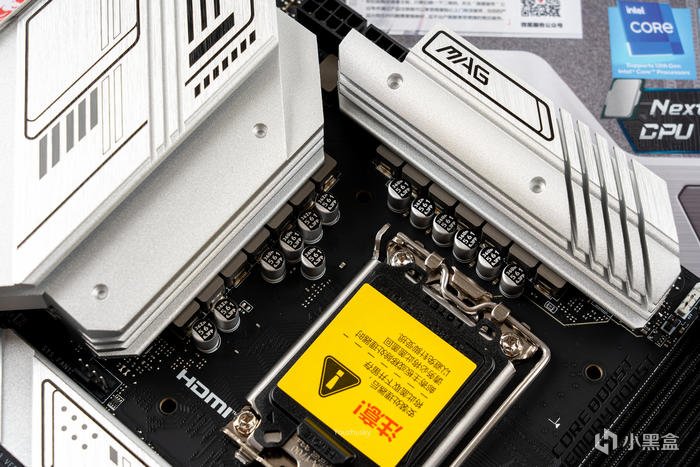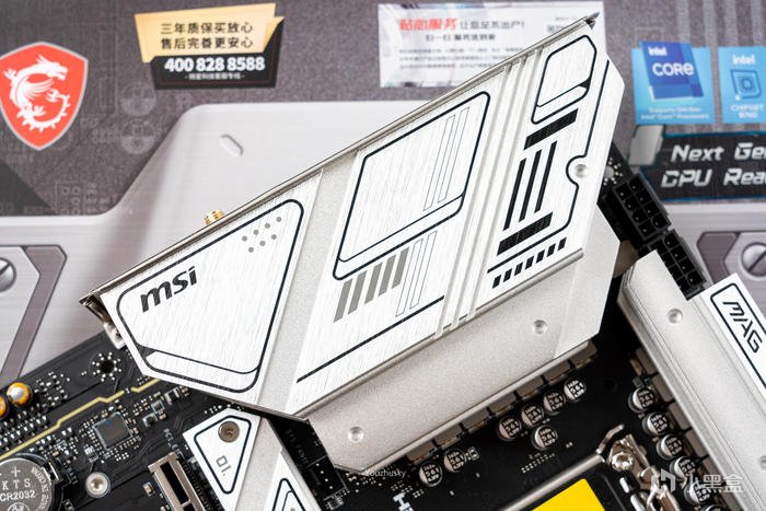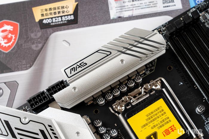 頂部的VRM散熱片上依然保持較厚實的高度和斜切紋理散熱,並上面標識了MAG系列;雙8P的供電已經成爲了迫擊炮的標配,畢竟功耗、核心數量都是成正比的,默認的14900K也是能很好的支持