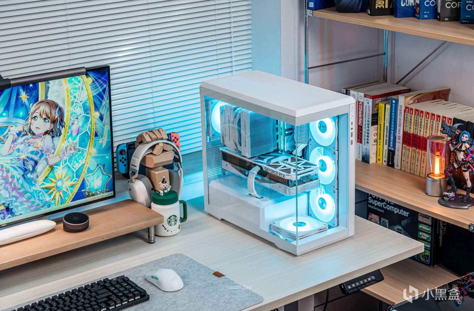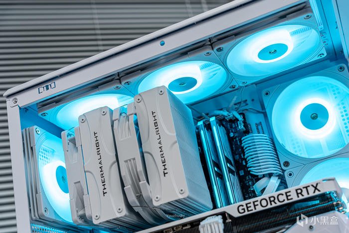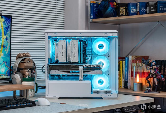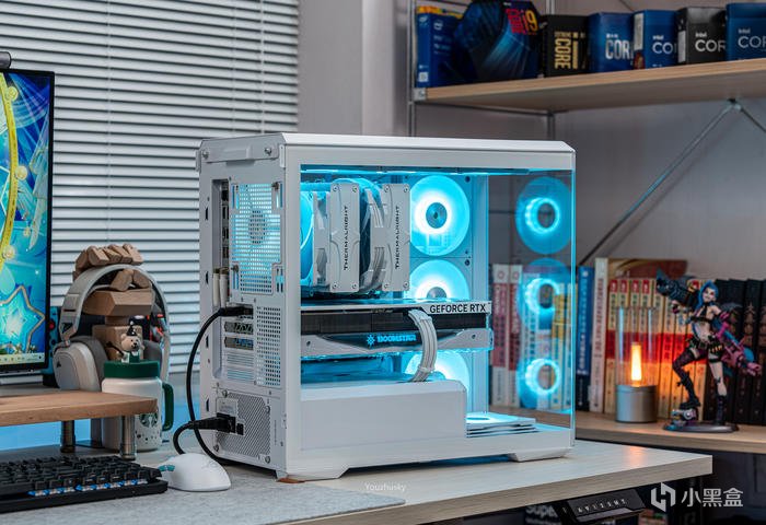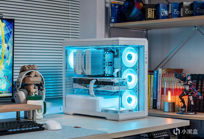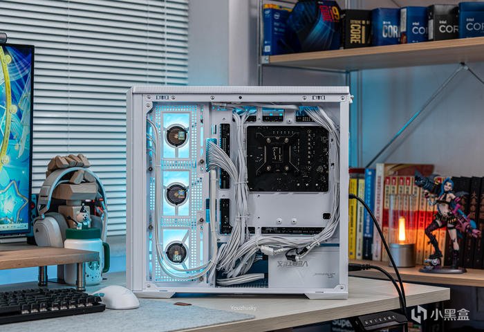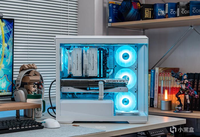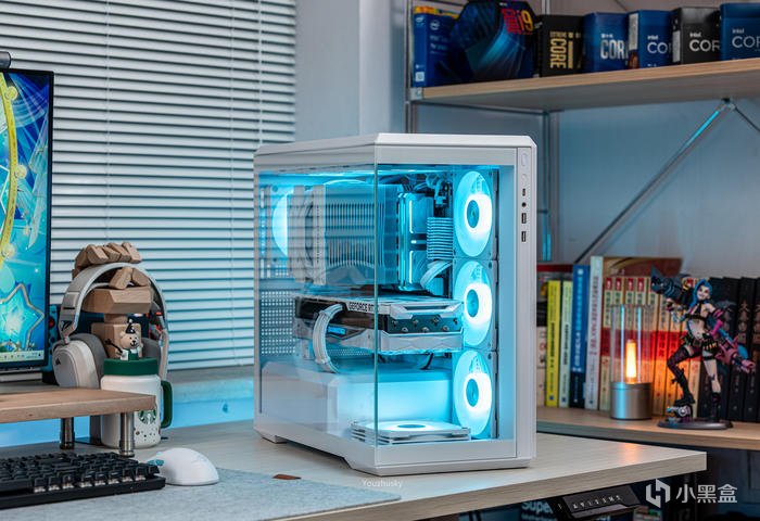 此次使用了13700KF的處理器,勝在其發熱不高風冷也可輕鬆駕馭,而保持英特爾八個大核心,性能只比13700K少了0.2GHZ的單頻率區別而已,使用的散熱則是這兩年期間風冷裏面比較親民的5根8mm熱管迴流焊的雙塔雙風扇的利民FC140WHITE(FROST COMMANDER)冰封統領白色款,主板爲微星最新的MAG B760M MORTAR WIFI II DDR5 迫擊炮二代,相比於一代它更新支持了3條M.2的PCIE 4.0 X4固態硬盤,以及更高頻率的DDR5 7800+ MHz內存支持,但任然保留了12路75A的智能供電(總共12+1+1)規格,以及其大規模的散熱配置和2盎司銅及6層PCB板。這樣三組搭配並使用主板的104微碼稍微降一丟丟電壓即可清涼使用i7。顯卡位4090星曜OC,它使用了600W散熱級別的星卓III散熱器,全覆蓋均熱板+9根鍍鎳複合熱管的超大規模,以及3個專屬102mm靜霜大風扇,顯卡本體更是配備20+4相全貼片的數字供電設計與600W 12VHPWR接口爲顯卡盡情釋放性能。電源使用的是海韻Vertex GX1000 White純白ATX3.0,這款海韻中端電源突出的特點上面主要有235%瞬時峯值功率超越intel ATX3.0標準、搭載智能IC保護控制、採用更安全的SDP智能雙重保護、中低負載智能啓停的數字 IC 溫控技術配合135mm FDB動態液壓軸承風扇轉速曲線更靜音。固態硬盤是8通道羣聯PS5018-E18主控的影馳HOF EXTREME30 PCIE4.0 1TB ,它採用了全鋁CNC曲面工藝純白定製的曲鏡白泳散熱器,五年質保支持個人送保。內存是白色的宇瞻ZADARK DDR5 6000燈條內存,採用它主要是其支持intel XMP與AMD EXPO雙認證,以及整體白色的顏值和燈效支持。最後使用了利民的4把TL-B12RW-S反葉風扇作爲進風,4把TL-B12W-S正葉風扇作爲出風,可保持處理器與顯卡的整機涼快運行。