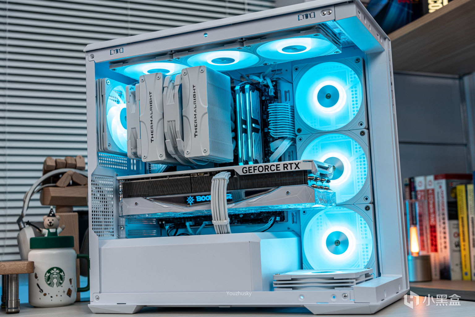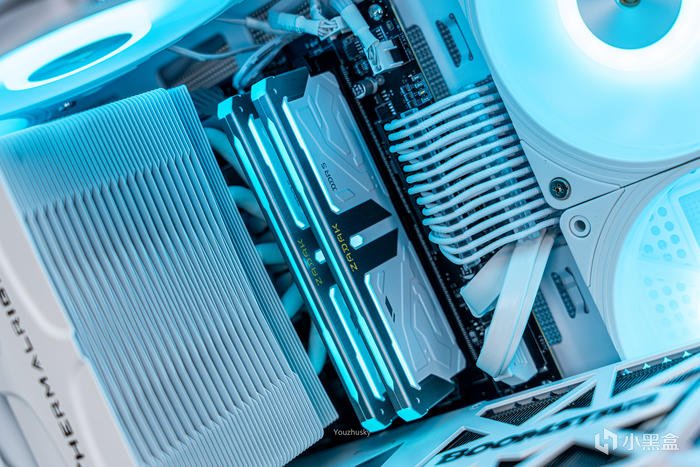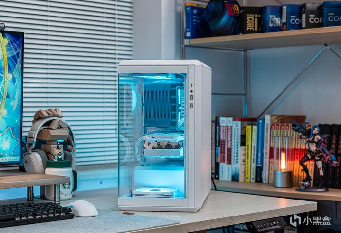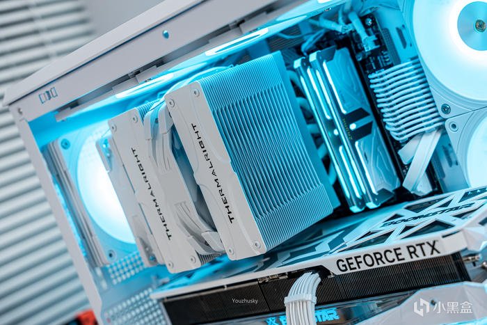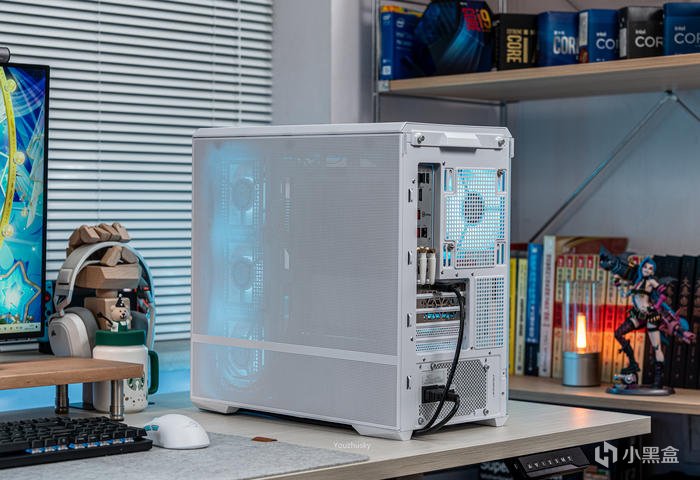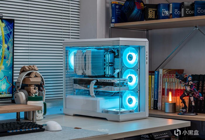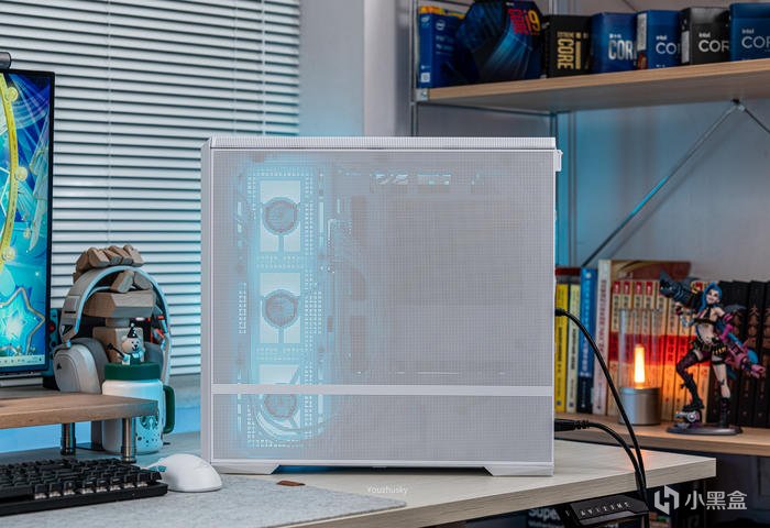 此次使用了13700KF的處理器,勝在其發熱不高風冷也可輕鬆駕馭,而保持英特爾八個大核心,性能只比13700K少了0.2GHZ的單頻率區別而已,使用的散熱則是這兩年期間風冷裏面比較親民的5根8mm熱管迴流焊的雙塔雙風扇的利民FC140WHITE(FROST COMMANDER)冰封統領白色款,主板爲微星最新的MAG B760M MORTAR WIFI II DDR5 迫擊炮二代,相比於一代它更新支持了3條M.2的PCIE 4.0 X4固態硬盤,以及更高頻率的DDR5 7800+ MHz內存支持,但任然保留了12路75A的智能供電(總共12+1+1)規格,以及其大規模的散熱配置和2盎司銅及6層PCB板。這樣三組搭配並使用主板的104微碼稍微降一丟丟電壓即可清涼使用i7。顯卡位4090星曜OC,它使用了600W散熱級別的星卓III散熱器,全覆蓋均熱板+9根鍍鎳複合熱管的超大規模,以及3個專屬102mm靜霜大風扇,顯卡本體更是配備20+4相全貼片的數字供電設計與600W 12VHPWR接口爲顯卡盡情釋放性能。電源使用的是海韻Vertex GX1000 White純白ATX3.0,這款海韻中端電源突出的特點上面主要有235%瞬時峯值功率超越intel ATX3.0標準、搭載智能IC保護控制、採用更安全的SDP智能雙重保護、中低負載智能啓停的數字 IC 溫控技術配合135mm FDB動態液壓軸承風扇轉速曲線更靜音。固態硬盤是8通道羣聯PS5018-E18主控的影馳HOF EXTREME30 PCIE4.0 1TB ,它採用了全鋁CNC曲面工藝純白定製的曲鏡白泳散熱器,五年質保支持個人送保。內存是白色的宇瞻ZADARK DDR5 6000燈條內存,採用它主要是其支持intel XMP與AMD EXPO雙認證,以及整體白色的顏值和燈效支持。最後使用了利民的4把TL-B12RW-S反葉風扇作爲進風,4把TL-B12W-S正葉風扇作爲出風,可保持處理器與顯卡的整機涼快運行。