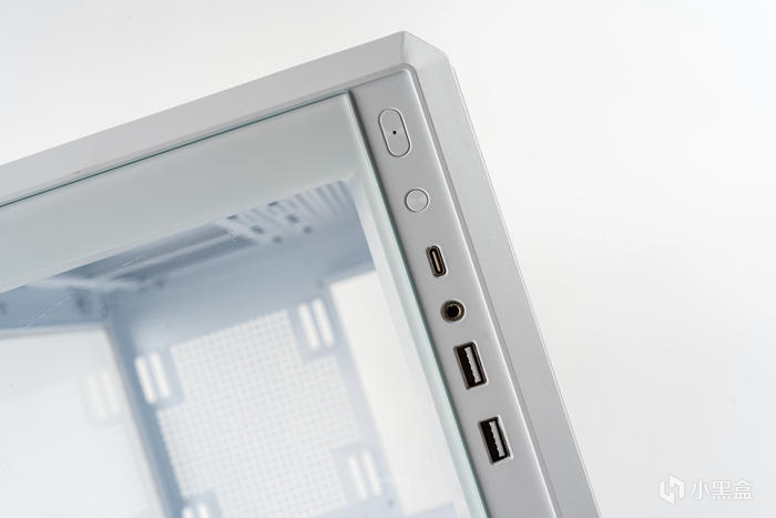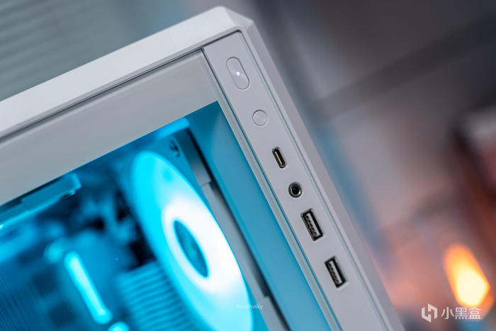 前置IO,從上至下依次爲開機鍵、重啓鍵、USB3.2 GEN2 10Gbps TYPE-C、耳機音頻2合一、USB3.0、USB3.0