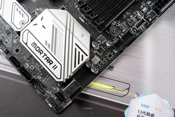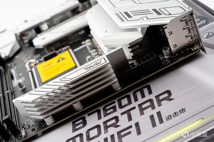 B760芯片組的散熱片,上面爲拉絲處理並有MORTAR II的迫擊炮二代標識,同時還有4個SATA存儲接口,和主板的前置USB3.0和TYPE-C接口