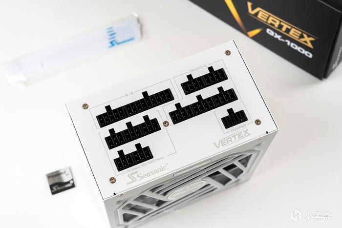 模組接口面,1000W也比較簡潔,區分了M/B、IDE/SATA、CPU/GPU、12VHPWR四個大塊來標識模組接口,底部則是SEASONIC海韻logo和VERTEX峯睿型號