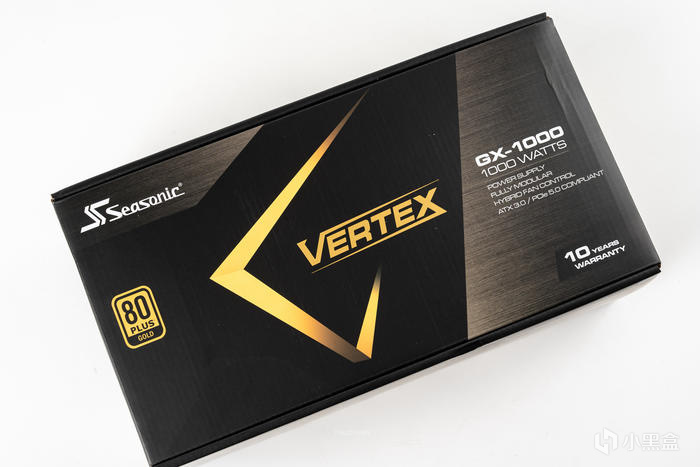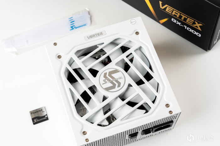 電源的本體,新的風扇進風口爲與整個電源殼體一體壓紋設計,中間爲海韻的LOGO,而頂部有一個型號的logo:VERTEX