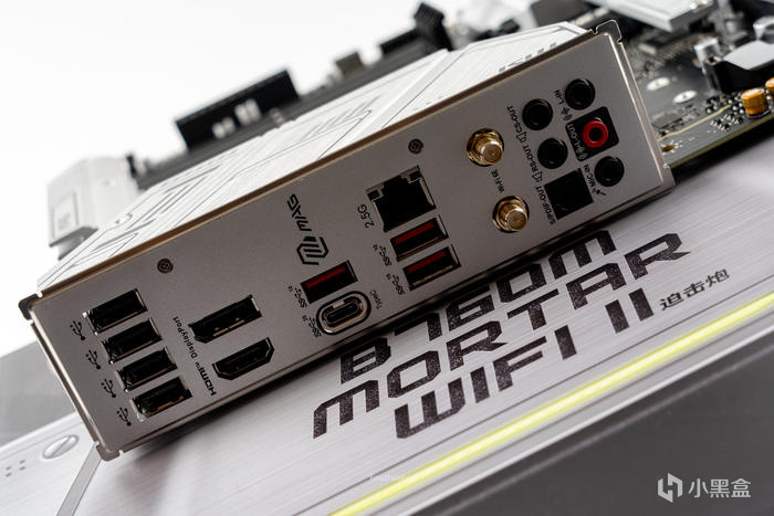 一體式IO護盾背板,接口IO從左至右依次提供瞭如下接口:4個USB2.0、集顯DP和HDMI口、1個20Gbps的USB3.2 GEN 2X2 Type-C口、3個10Gbps的USB3.2 GEN2 Type-A口、2.5G有線接口、WIFI6E接口以及7.1聲道音頻接口