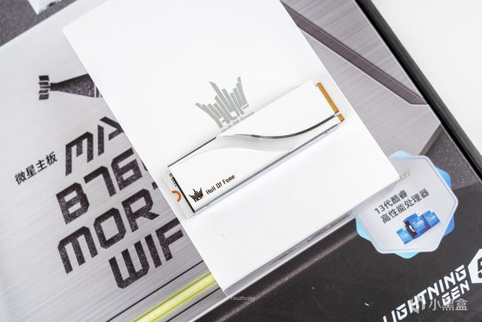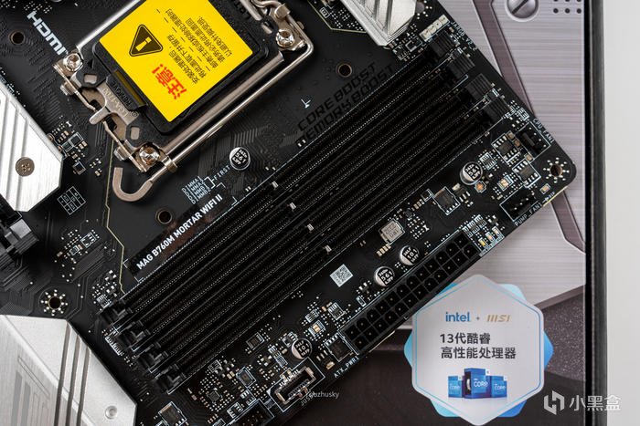 微星MAG系列最新發布的 B760M MORTAR WIFI II 迫擊炮二代,包裝中間顯示了大大的型號標識,左上角則是微星龍盾logo和三年質保800電話,右邊則是intel next Gen CPU READY和B760芯片組的雙標,底部則標識了MAG系列和支持lightning GEN 5,其實二代迫擊炮更新的最重要的點在於支持3條PCIE 4.0 M.2插槽和DDR5 7800+ MHz內存的支持