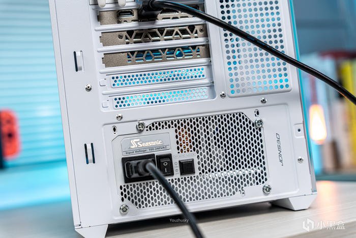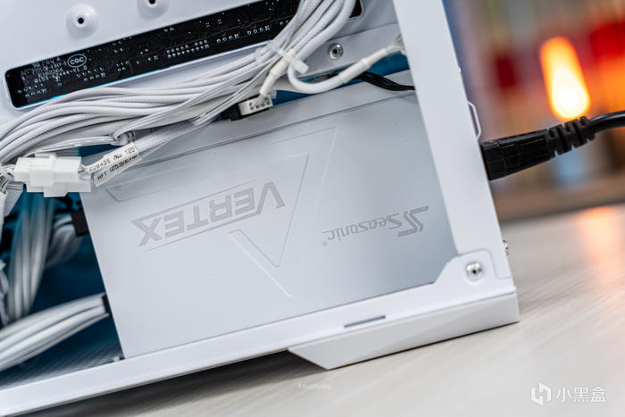 機箱尾部的海韻金屬銘牌,使用的電源爲海韻Vertex GX 1000 White 峯睿系列ATX3.0壓紋線全模組電源