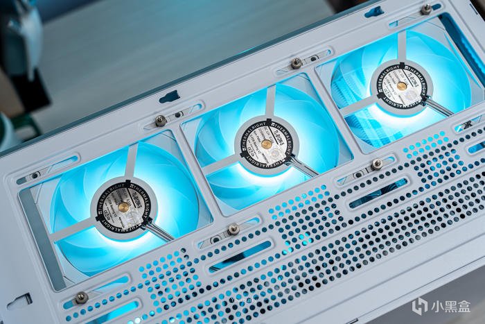 頂部面板下的三把正向風扇,利民TL-B12W-S ,採用S-FDB V2軸承、點膠3軸向動平衡和風壓性扇葉設計