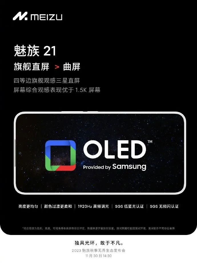 根據之前的信息,魅族21採用超窄邊的四等寬三星OLED直屏,邊框寬度僅有1.74mm,支持1920Hz高頻調光、SGS低藍光認證、無頻閃認證。