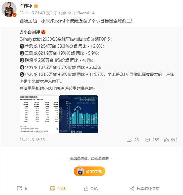 盧偉冰還表示,小米/Redmi平板最近定了個小目標是全球前三。
