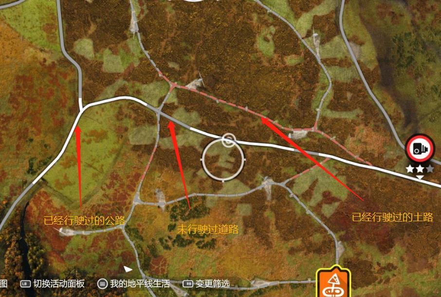 答:白色是跑过的公路,红灰色是跑过的土路,银色则是还未探索过的道路。(蓝色是你的导航)