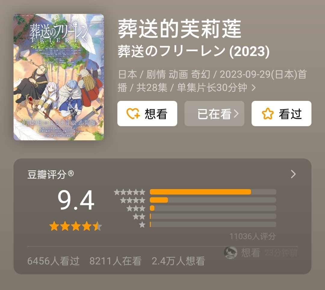 目前,《葬送的芙莉蓮》在國內知名評分網站豆瓣的評分爲9.4分,屬於高分的水平,值得一追!