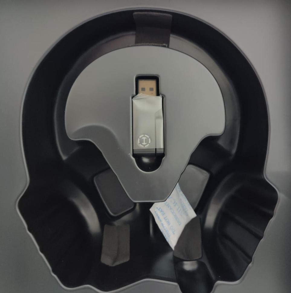 然後纔是被規規矩矩嵌在塑料保護殼中的耳機,中間靜置着2.4G的接收器,接收器延續了合二爲一的分體設計,由一個A口和一個C口接收器組合而成,可供不同接口的多平臺使用,不用時也不容易丟失