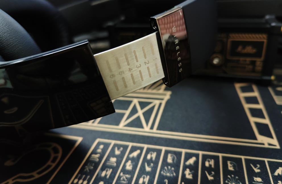 耳機可以通過伸縮進行長度調節,但無法摺疊,伸縮的金屬桿上標有刻度,一共九格,前面每格的阻尼感都很明顯,不過接近最大長度的時候有點不夠,很容易縮回
