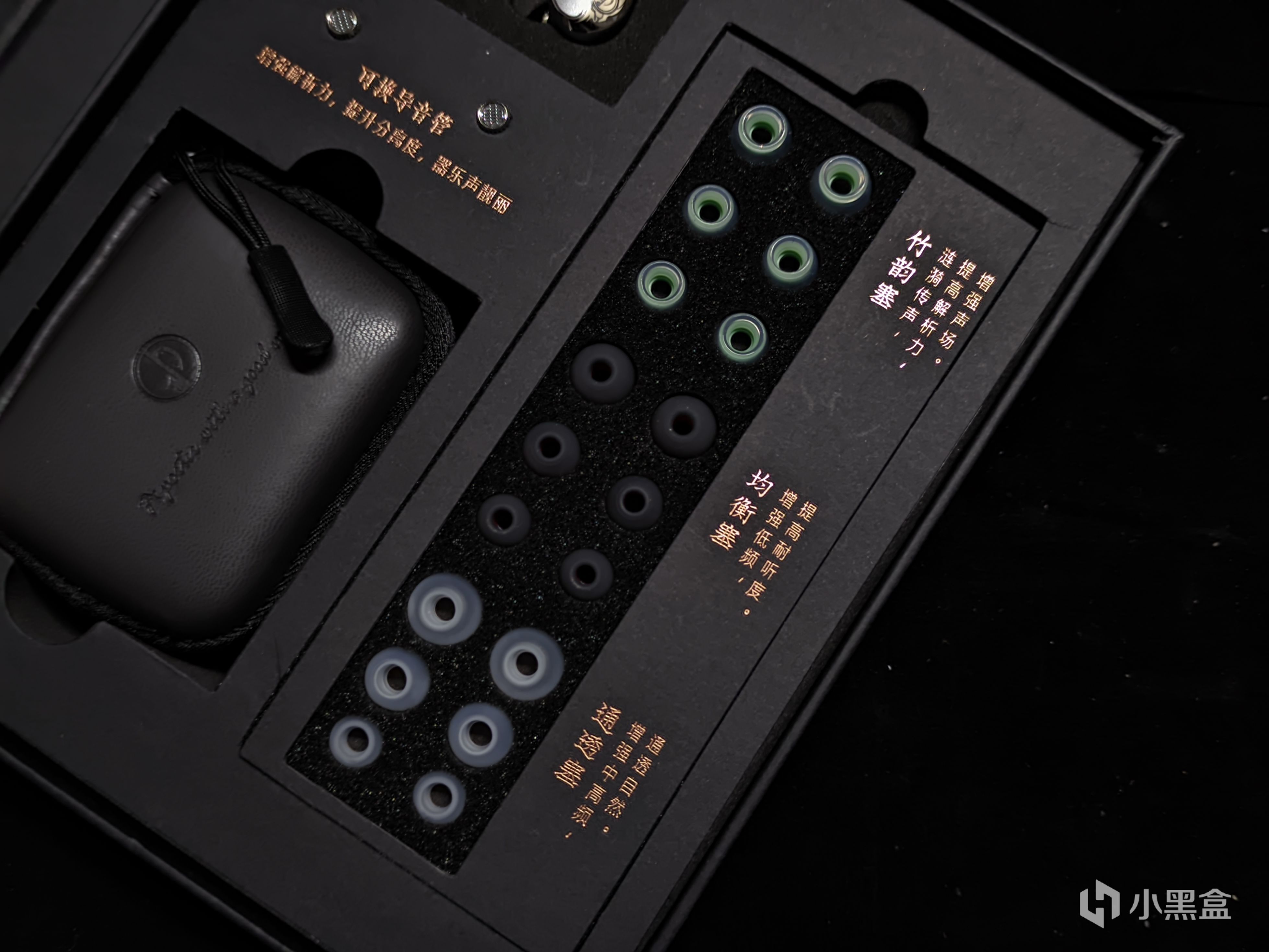 而打開包裝之後,就是本次的所有內容了,左側是一個固定住的小文件夾的樣式,通過漏出的小耳朵,你可以抽出相對應的小卡片,顯得還蠻高端的,內容寫的也還算詳細,對於新人來說算是很友好了,但其本身想要裝回去的話,需要對齊再放入,否則會出現高度不一致的情況,顯得稍微有些糟糕,而左邊就是主要區域了,分別有着耳機本體,一份可替換導音管,一個耳機包,包內帶有配套的耳機線,以及九對耳塞,是的,足足九對耳塞。