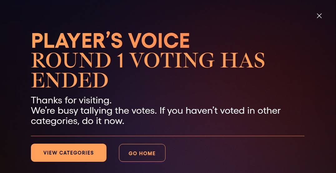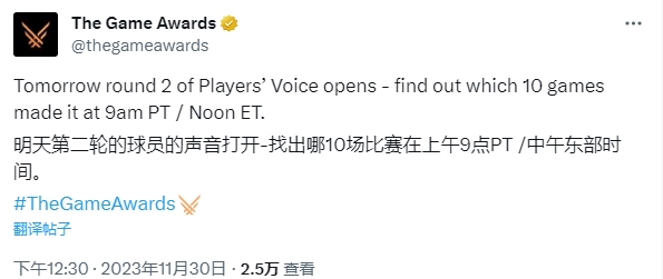 TGA 提醒:明天第二輪玩家之聲投票即將開始。目前第二輪投票通道尚未開啓,TGA 正在統計選票。如果您還沒有在其他類別中投票,請立即投票。點擊投票:傳送門。