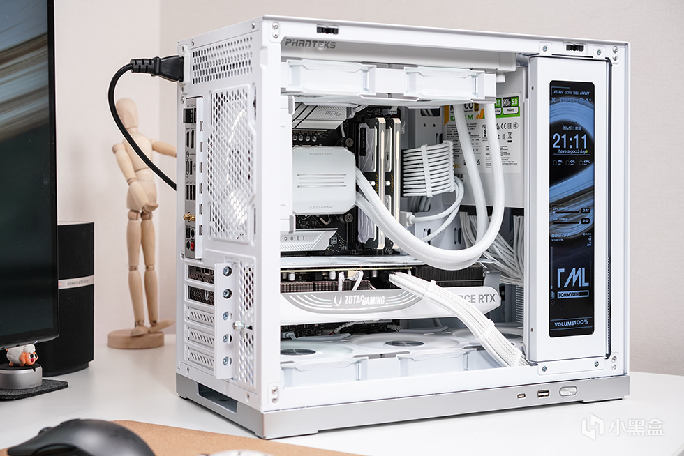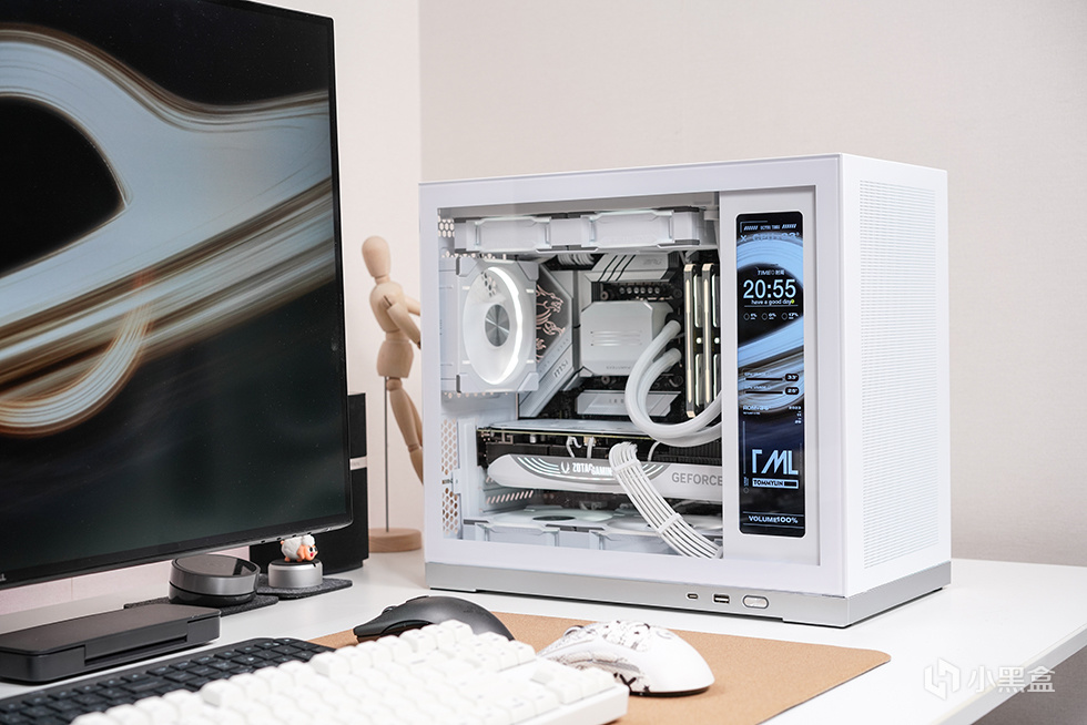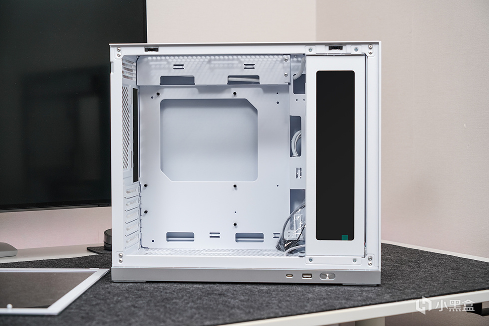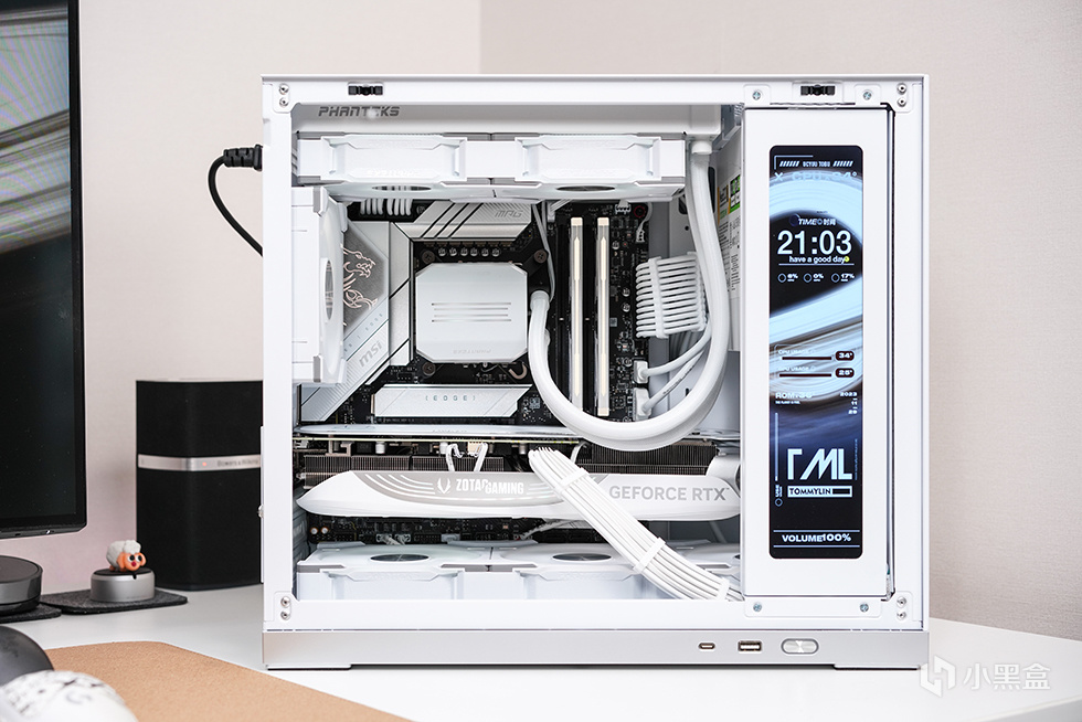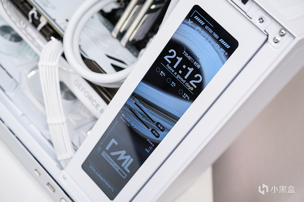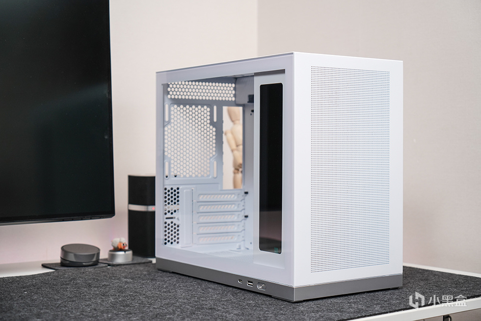 白色主體搭配了銀色的底部窄邊框架,使得整體方正簡潔的設計不會那麼單調,高透的玻璃側板能更好的展現內部硬件結構,原本側面的裝飾蓋板換成了11.3寸的副屏,個性一下子就出來了。