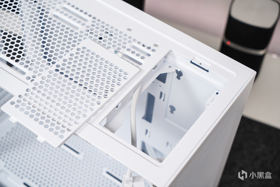移除頂部的磁吸防塵網後,可以看到頂部結構支持最大240冷排的安裝,前部留出了ATX規格電源吊裝的位置。