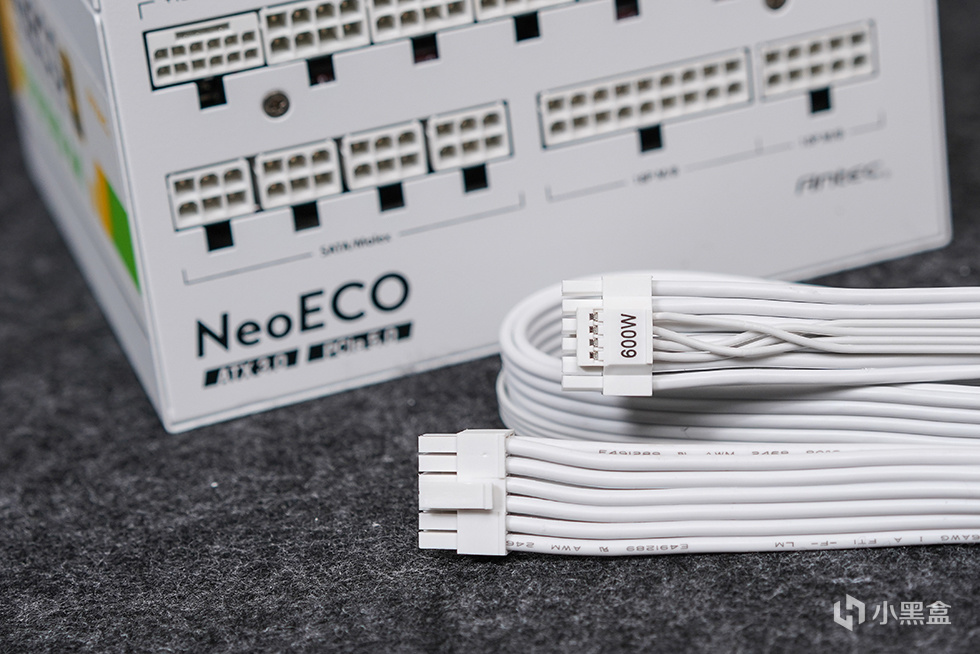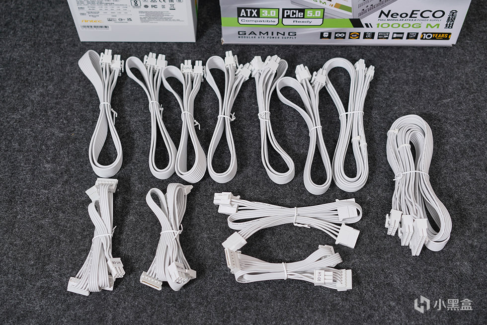 安鈦克 NeoECO 1000G M電源全模組線材均採用扁線設計,並採用同色(白色)接頭端子。提供1 條 24pin 主板供電線,2 條雙 4+4pin 的 CPU 供電線,4 條 6+2pin 的 PCI-E 供電線,1 條 16Pin PCI-E 5.0 12VHPWR 供電線,3 條 4 口的 SATA 接口供電線,以及 1 條四口大 4PIN 接口線。